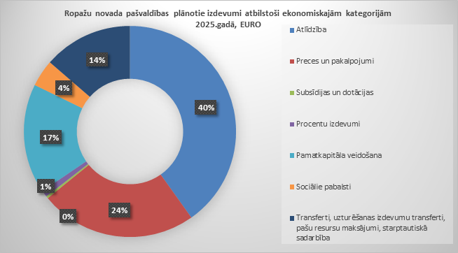 Būtisks izdevumu samazinājums saistīts, galvenokārt, ar samazinājumu pamatlīdzekļu izveidošanā – par 1 074 670 euro, pamatojoties uz to, ka dažādu apstākļu dēļ 2025. gadā netika īstenoti vairāki investīciju projekti, tajā skaitā, tie, kuriem sākotnēji tika plānots valsts kases aizņēmums. Šiem investīciju projektiem finansēšanas sadaļā tiek izņemts finansējuma apjoms no valsts kases aizņēmuma un attiecīgi par šo summu samazināti izdevumi (933 402 euro). Savukārt, atlikusī pašvaldības finansējuma daļa tika novirzīta iestādēm/struktūrvienībām uz izdevumiem, par kuriem tika saņemts papildu finansējuma pieprasījums uz pašvaldības 2025. gada budžeta grozījumiem.