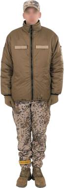 1.3.2. vēsu laikapstākļu kostīma jaka (6. attēls) brūnā krāsā ar detaļām no auduma ar maskēšanās rakstu "LatPat" vai "MultiLatPat" (1., 2. attēls) vai vienkrāsaina auduma detaļām bez maskēšanās raksta;