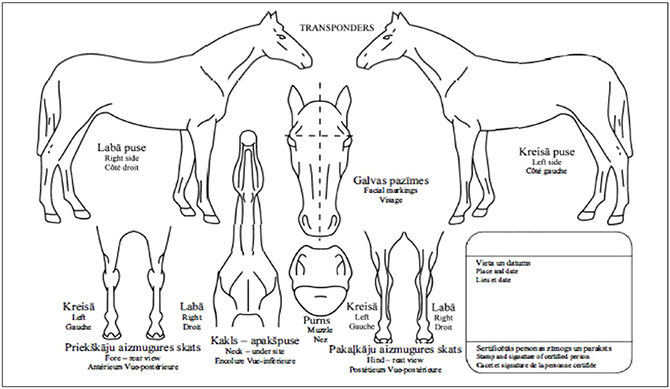 58. Vērtēšanas eksperts vai praktizējošs veterinārārsts zirgu apzīmē, implantējot injicējamo transponderu atbilstoši regulas 2021/963 13. panta 2. punktā noteiktajām prasībām. Pēc zirga apzīmēšanas ar injicējamo transponderu vērtēšanas eksperts aizpilda zirga reģistrācijas kartīti (pielikums) divos eksemplāros un nodod to dzīvnieku operatoram.