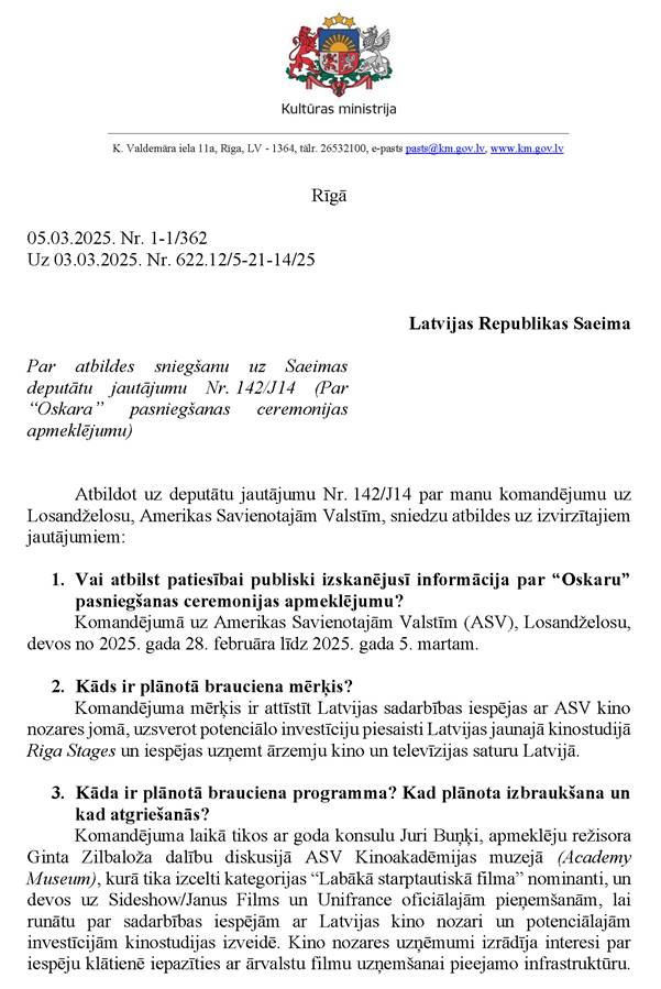 Deputātu Lindas Liepiņas, Ramonas Petravičas, Aināra Šlesera, Kristapa Krištopana un Ilzes Stobovas jautājums kultūras ministrei Agnesei Lācei "Par "Oskara" pasniegšanas ceremonijas apmeklējumu". Saņemtā rakstveida atbilde iesniedzējus neapmierina, bet mutvārdos papildjautājumus uzdot nevēlas.