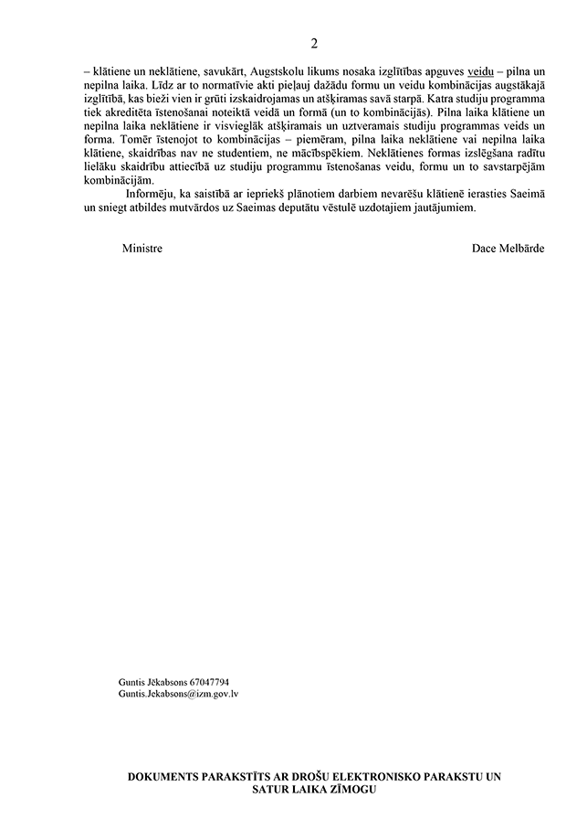 Deputātu Ilzes Stobovas, Aināra Šlesera, Kristapa Krištopana, Lindas Liepiņas un Ramonas Petravičas jautājums izglītības un zinātnes ministrei Dacei Melbārdei "Par neklātienes mācību formas aizstāšanu ar kombinēto mācību". Saņemtā rakstveida atbilde iesniedzējus neapmierina, bet mutvārdos papildjautājumus deputāti uzdot nevēlas.