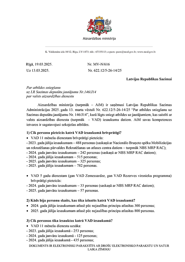 Labrīt, godātie Saeimas deputāti! Šis likumprojekts paredz Latvijas Republikas izstāšanos no Otavas konvencijas, pamatojoties uz reģionālās drošības situācijas izmaiņām un pastāvīgiem militāriem draudiem Baltijas reģionam, ko rada Krievijas Federācija, kura turpina īstenot agresīvu ārpolitiku, pārkāpjot starptautiskās tiesības. Krievijas uzbrukums Ukrainai, nelikumīgā teritoriju aneksija un masveida kara noziegumi, kā arī atkārtotie draudi Baltijas valstīm rada fundamentālas izmaiņas drošības situācijā, pieprasot Latvijai būt gatavai pilnvērtīgai aizsardzībai.