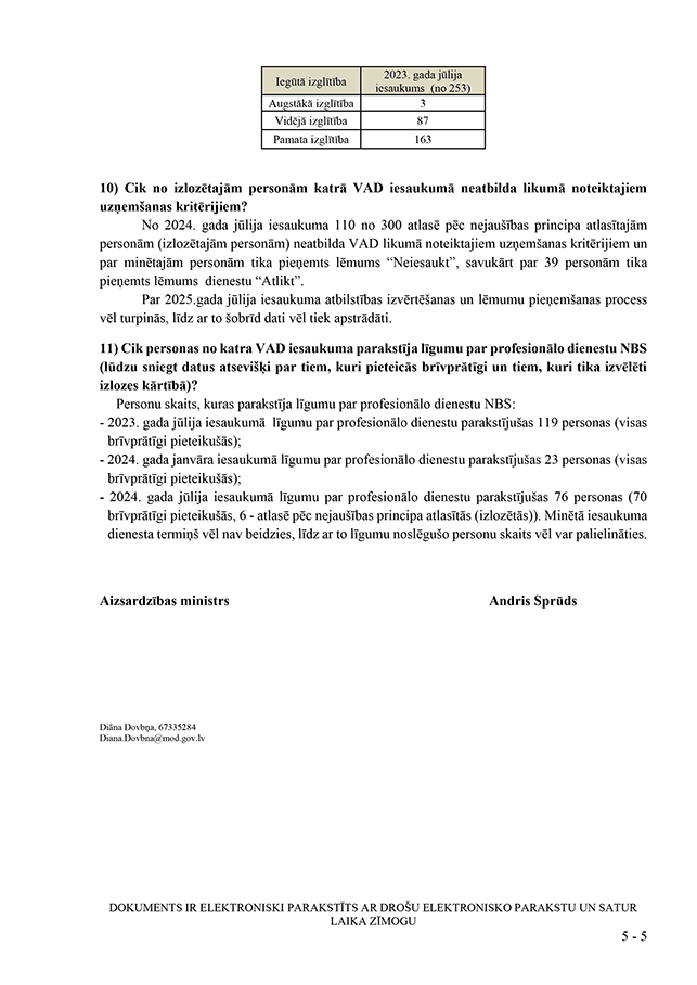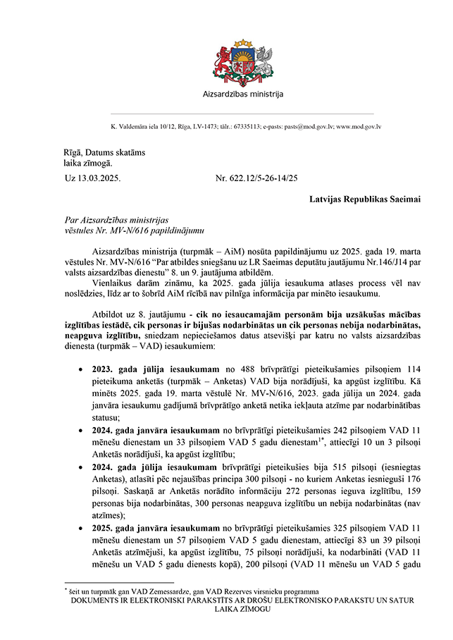 Deputātu Ināras Mūrnieces, Jāņa Dombravas, Edvīna Šnores, Edmunda Teirumnieka un Raivja Dzintara jautājums aizsardzības ministram Andrim Sprūdam "Par valsts aizsardzības dienestu". Tika iesniegts 13. martā. Saņemtā rakstveida atbilde iesniedzējus apmierina.