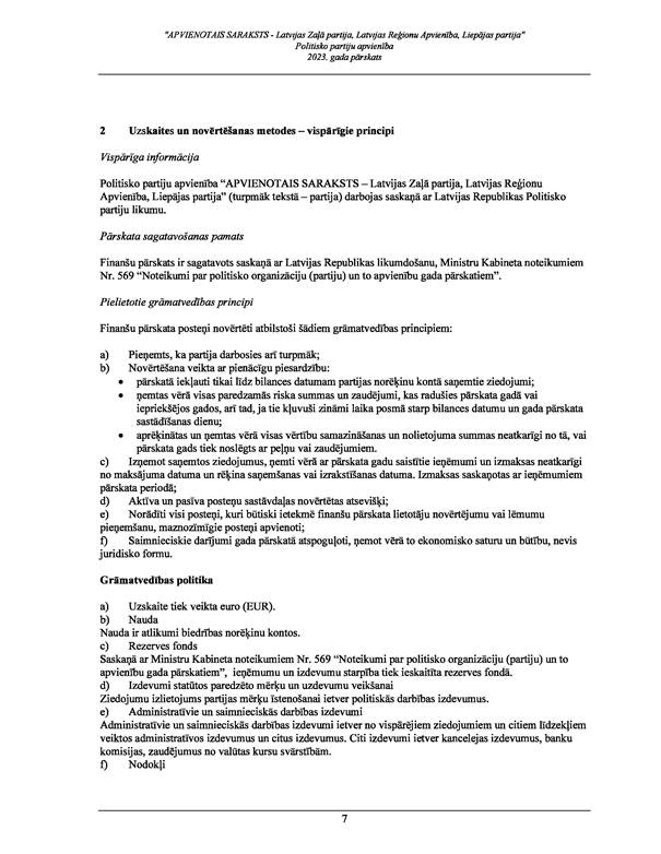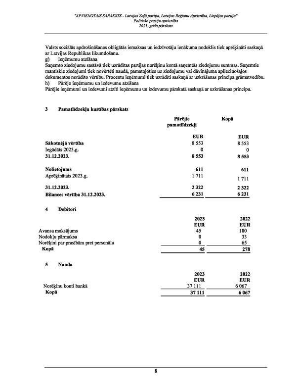 Politisko partiju apvienības "APVIENOTAIS SARAKSTS - Latvijas Zaļā partija, Latvijas Reģionu Apvienība, Liepājas partija", reģ. Nr. 50008221771, precizēts gada pārskats par 2023. gadu, EUR