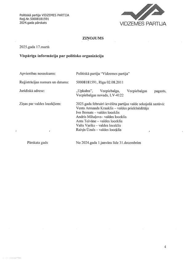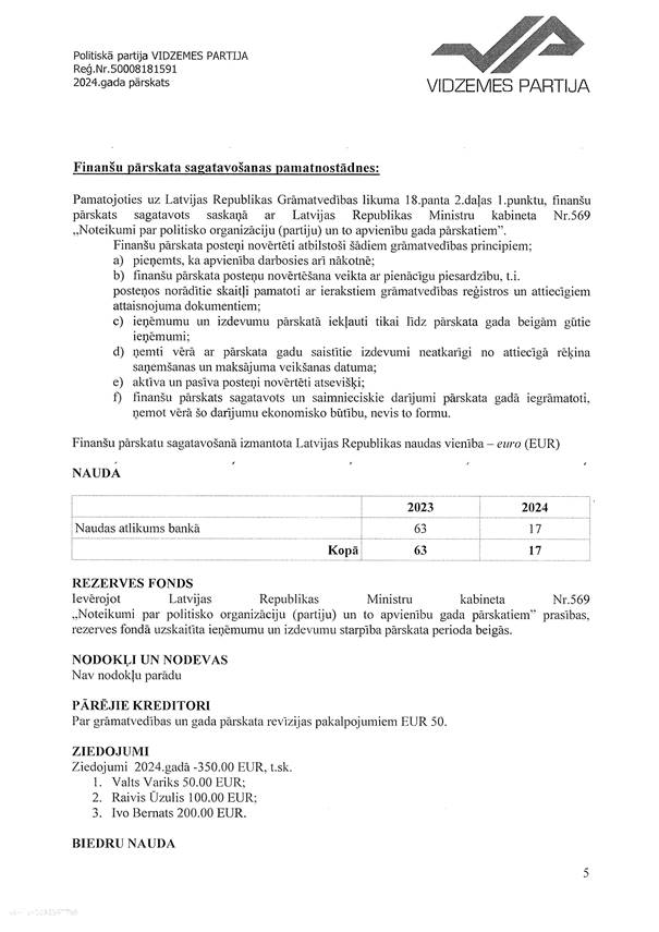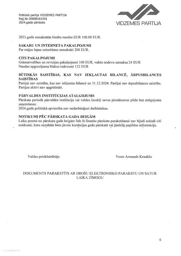 Politiskās partijas "VIDZEMES PARTIJA", reģ. Nr. 50008181591, 2024. gada pārskats, EUR
