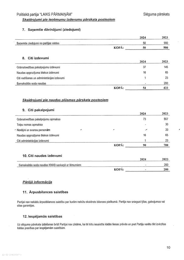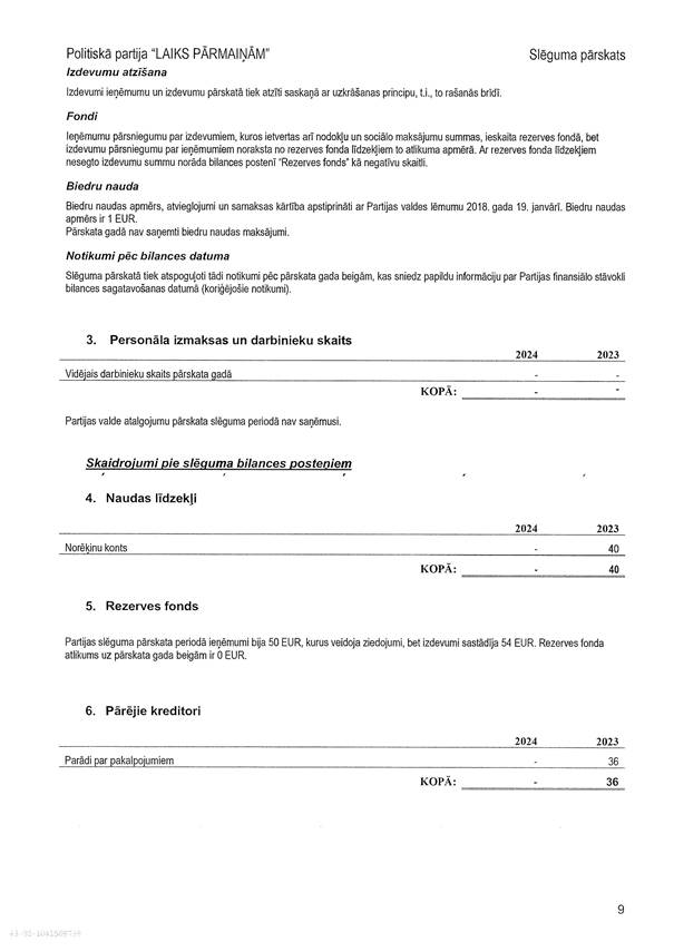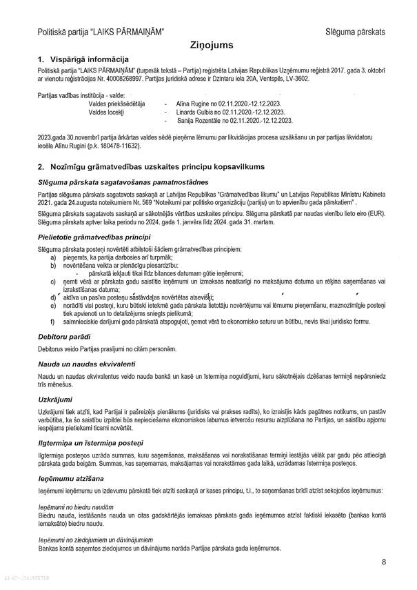 Politiskās partijas "LAIKS PĀRMAIŅĀM", reģ. Nr. 40008268997, 2024. gada pārskats, EUR