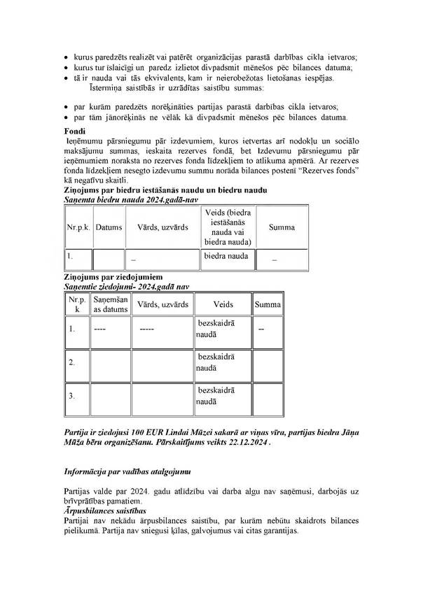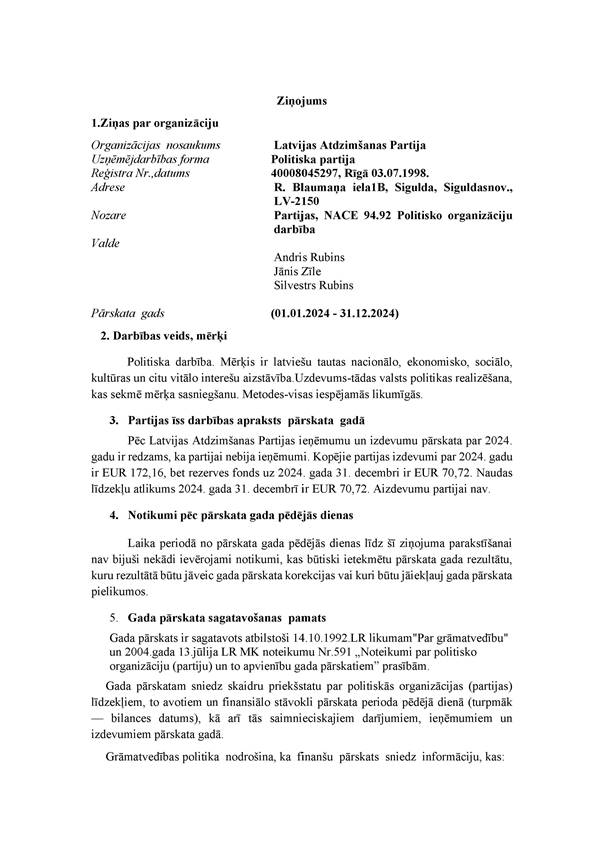 Politiskās partijas "Latvijas Atdzimšanas partija", reģ. Nr. 40008045297, 2024. gada pārskats, EUR