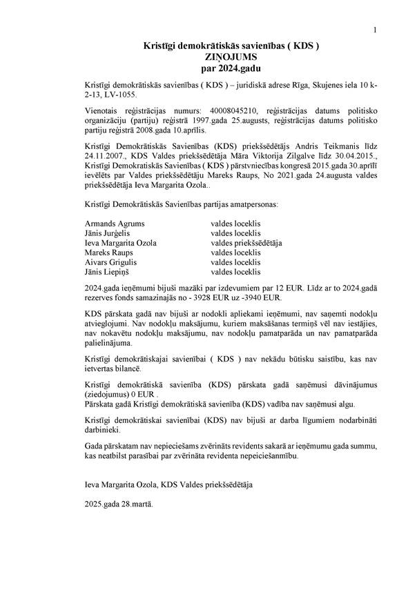 Politiskās partijas "Kristīgi demokrātiskā savienība", reģ. Nr. 40008045210, 2024. gada pārskats, EUR