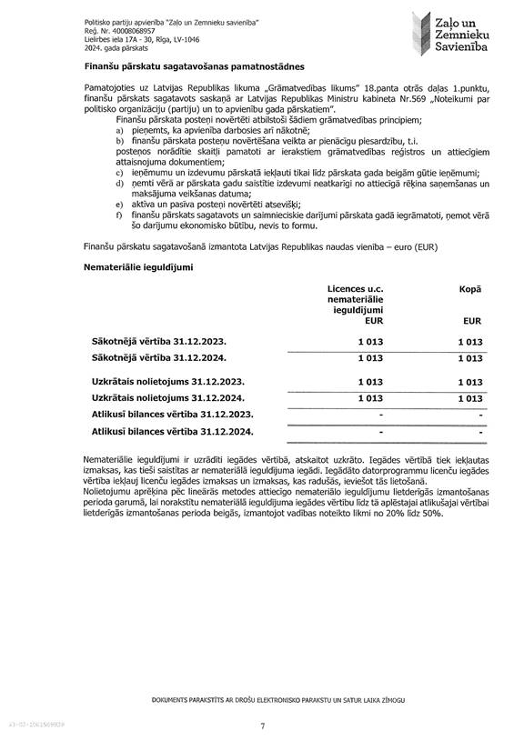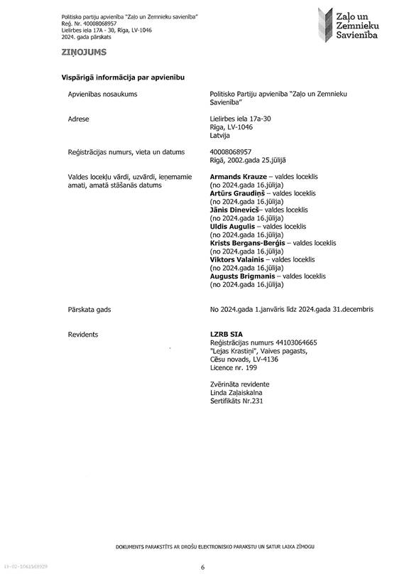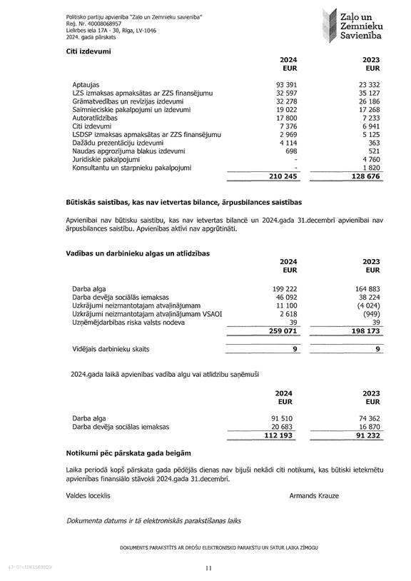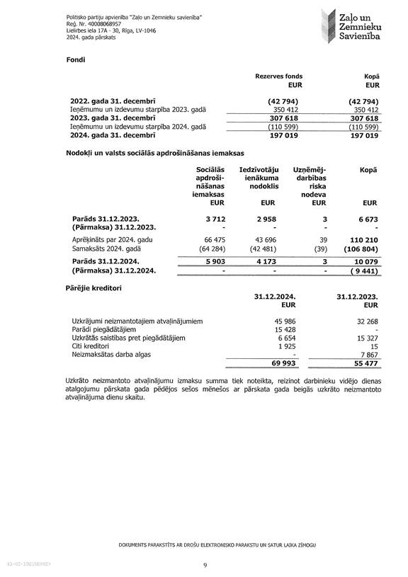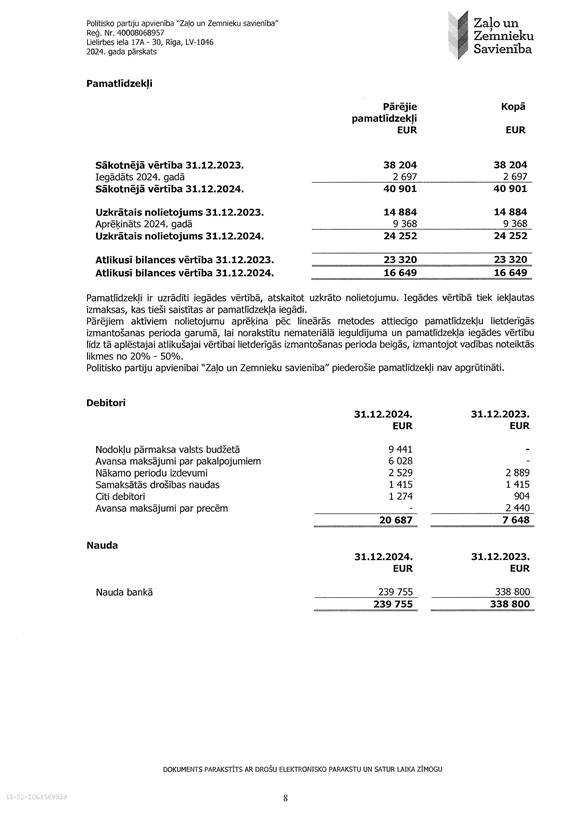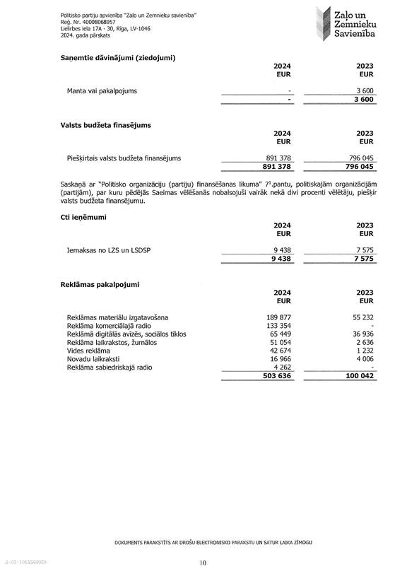 Politisko partiju apvienības "Zaļo un Zemnieku savienība", reģ. Nr. 40008068957, 2024. gada pārskats, EUR