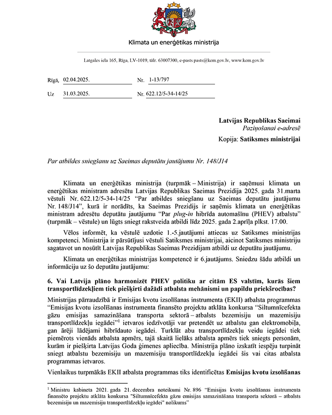 Deputātu Amila Saļimova, Iļjas Ivanova, Jefimija Klementjeva, Igora Judina un Dmitrija Kovaļenko jautājums klimata un enerģētikas ministram Kasparam Melnim "Par plug-in hibrīda automašīnu (PHEV) atbalstu".
