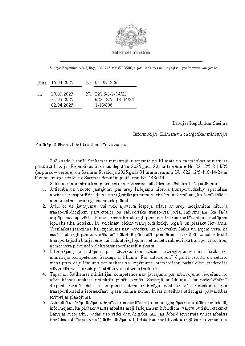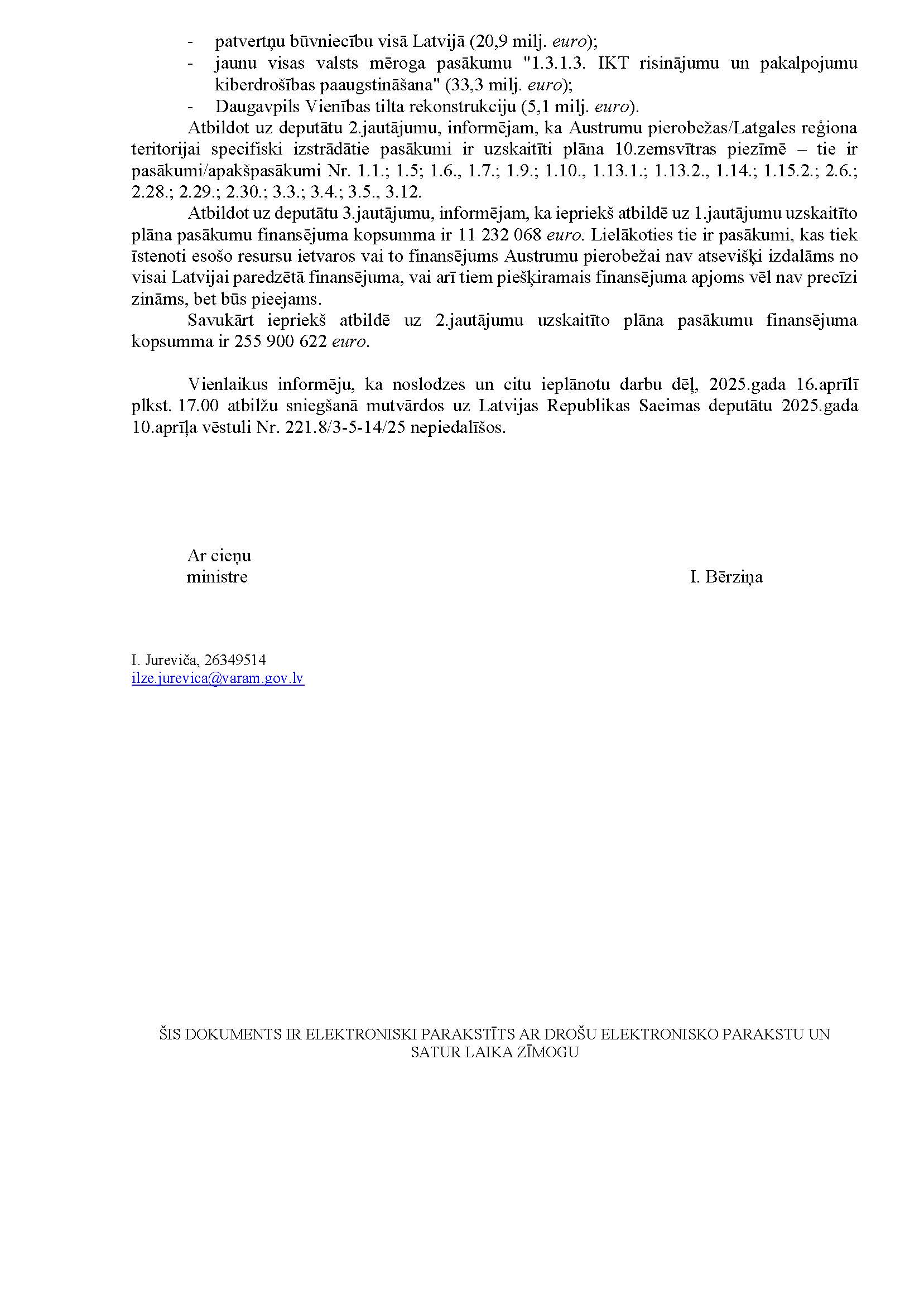 Deputātu Jura Viļuma, Česlava Batņas, Aivas Vīksnas, Laura Lizbovska un Andra Kulberga jautājums viedās administrācijas un reģionālās attīstības ministrei Ingai Bērziņai "Par Rīcības plāna Latvijas Austrumu pierobežas ekonomiskajai izaugsmei un drošības stiprināšanai 2025.–2027. gadam reālo papildus pienesumu". Saņemtā rakstveida atbilde iesniedzējus neapmierina, bet ministre informē, ka nevar ierasties un sniegt mutvārdu atbildi noslodzes... un citu ieplānoto darbu dēļ.