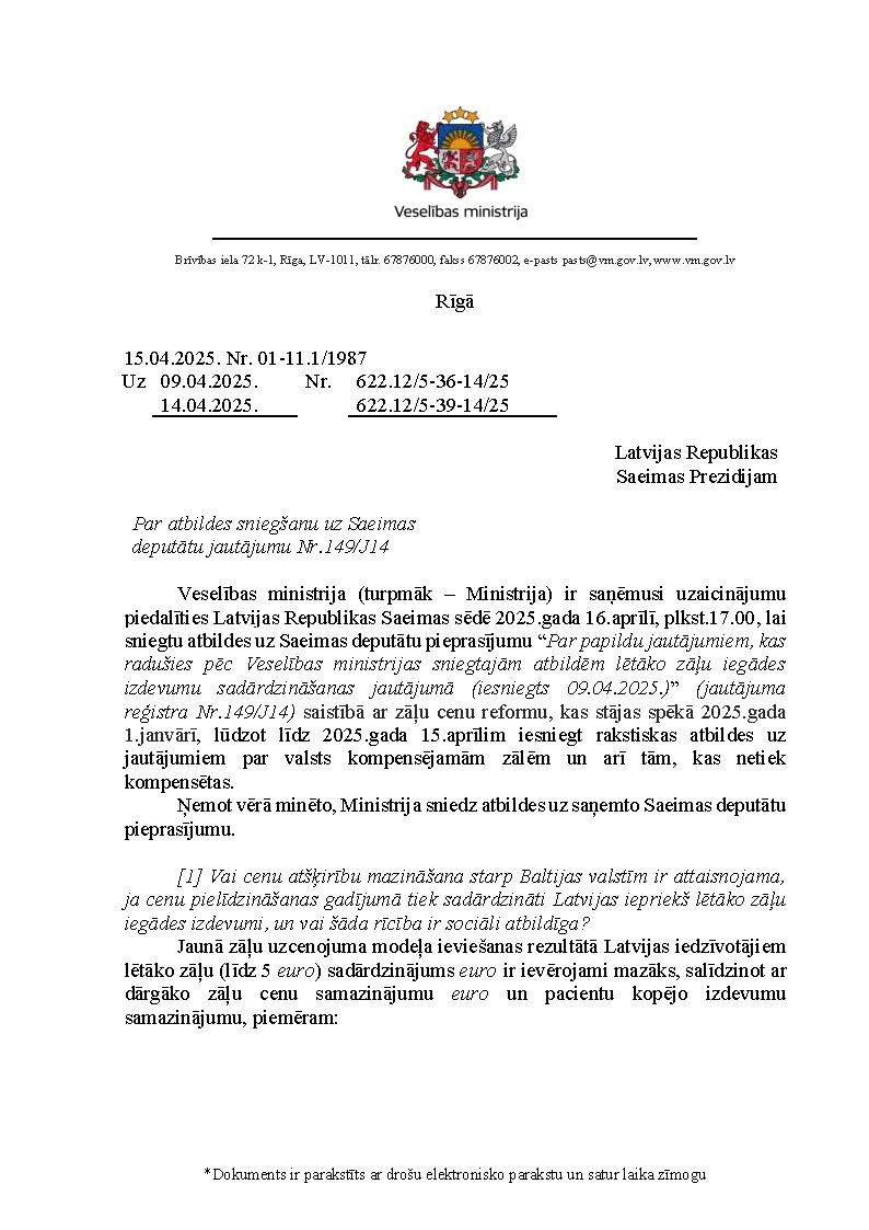 Deputātu Ramonas Petravičas, Lindas Liepiņas, Kristapa Krištopana, Viktorijas Pleškānes un Edmunda Zivtiņa jautājums veselības ministram Hosamam Abu Meri "Par papildu jautājumiem, kas radušies pēc Veselības ministrijas sniegtajām atbildēm lētāko zāļu iegādes izdevumu sadārdzināšanas jautājumā". Saņemtā rakstveida atbilde iesniedzējus apmierina. (Starpsauciens.)