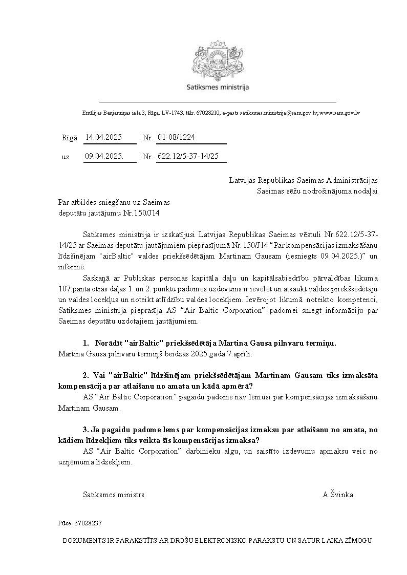 Deputātu Svetlanas Čulkovas, Alekseja Rosļikova, Nataļjas Marčenko-Jodko, Amila Saļimova un Iļjas Ivanova jautājums satiksmes ministram Atim Švinkam "Par kompensācijas izmaksāšanu līdzšinējam "airBaltic" valdes priekšsēdētājam Martinam Gausam". Saņemtā rakstveida atbilde iesniedzējus neapmierina, bet mutvārdos papildjautājumus uzdot nevēlas. Ministrs ir arī informējis, ka šodien ir aizņemts.