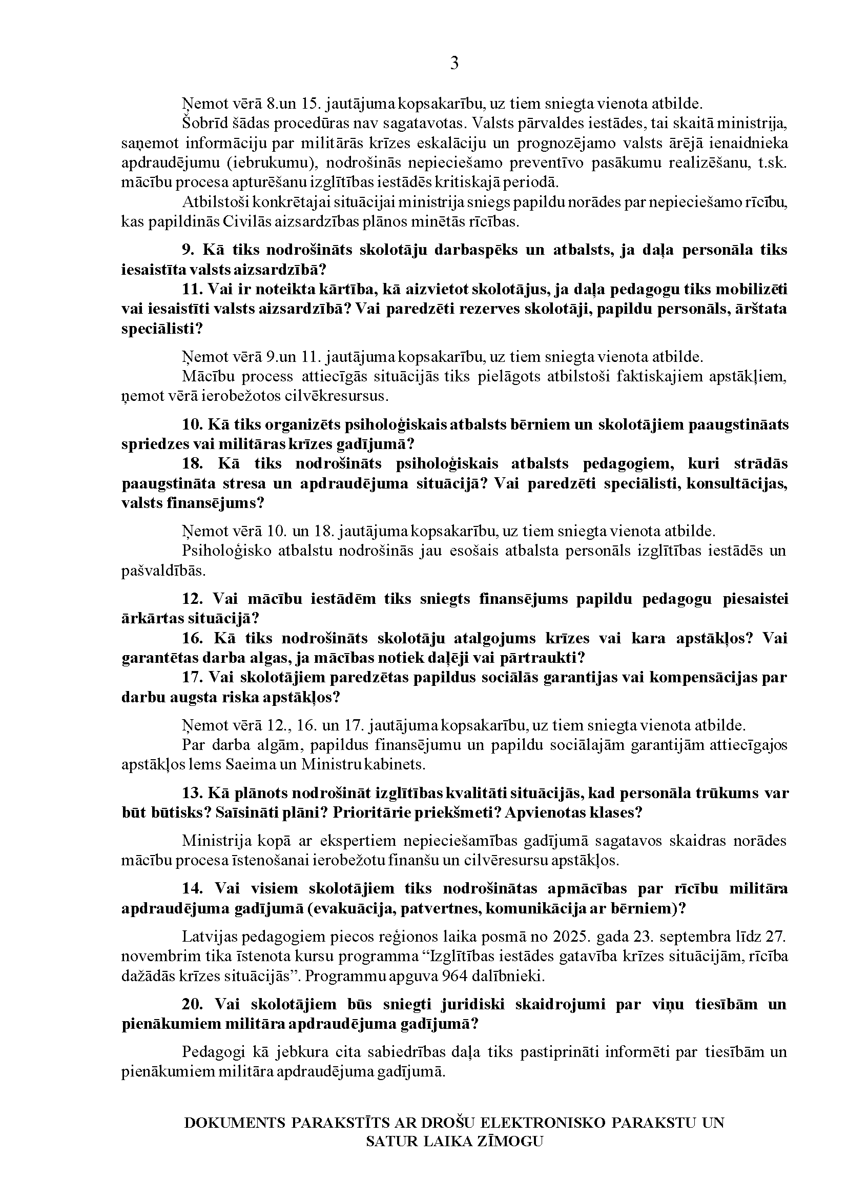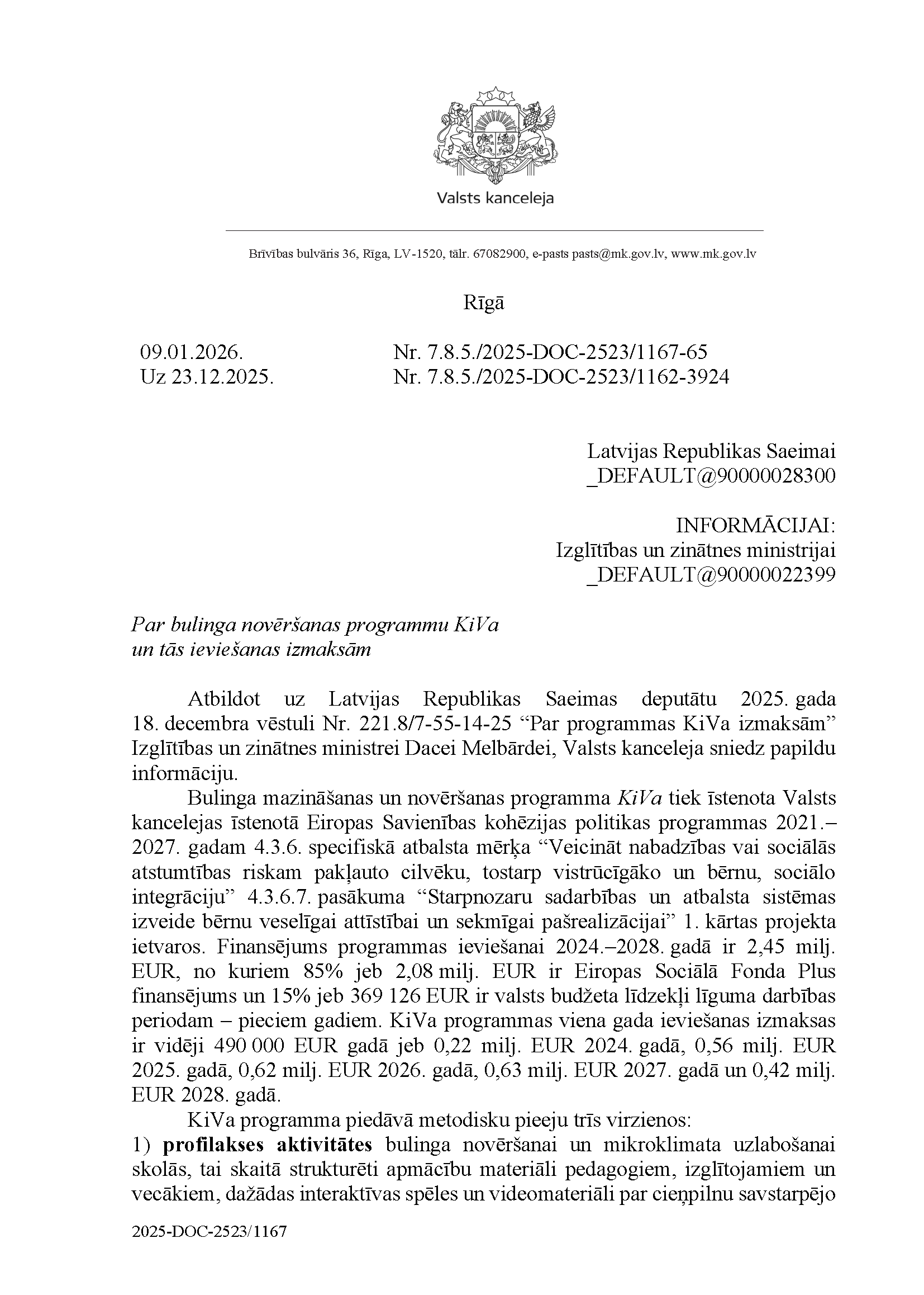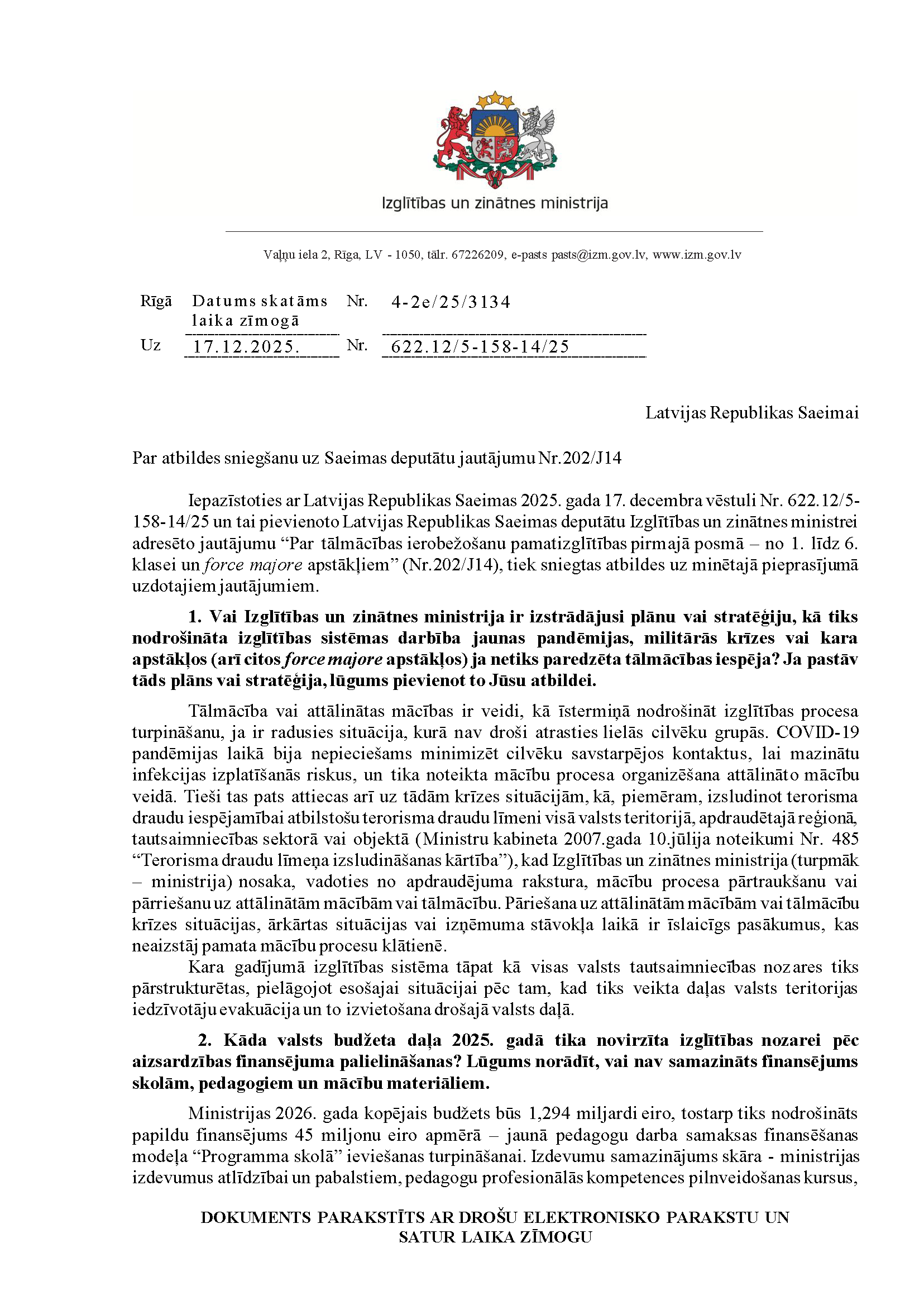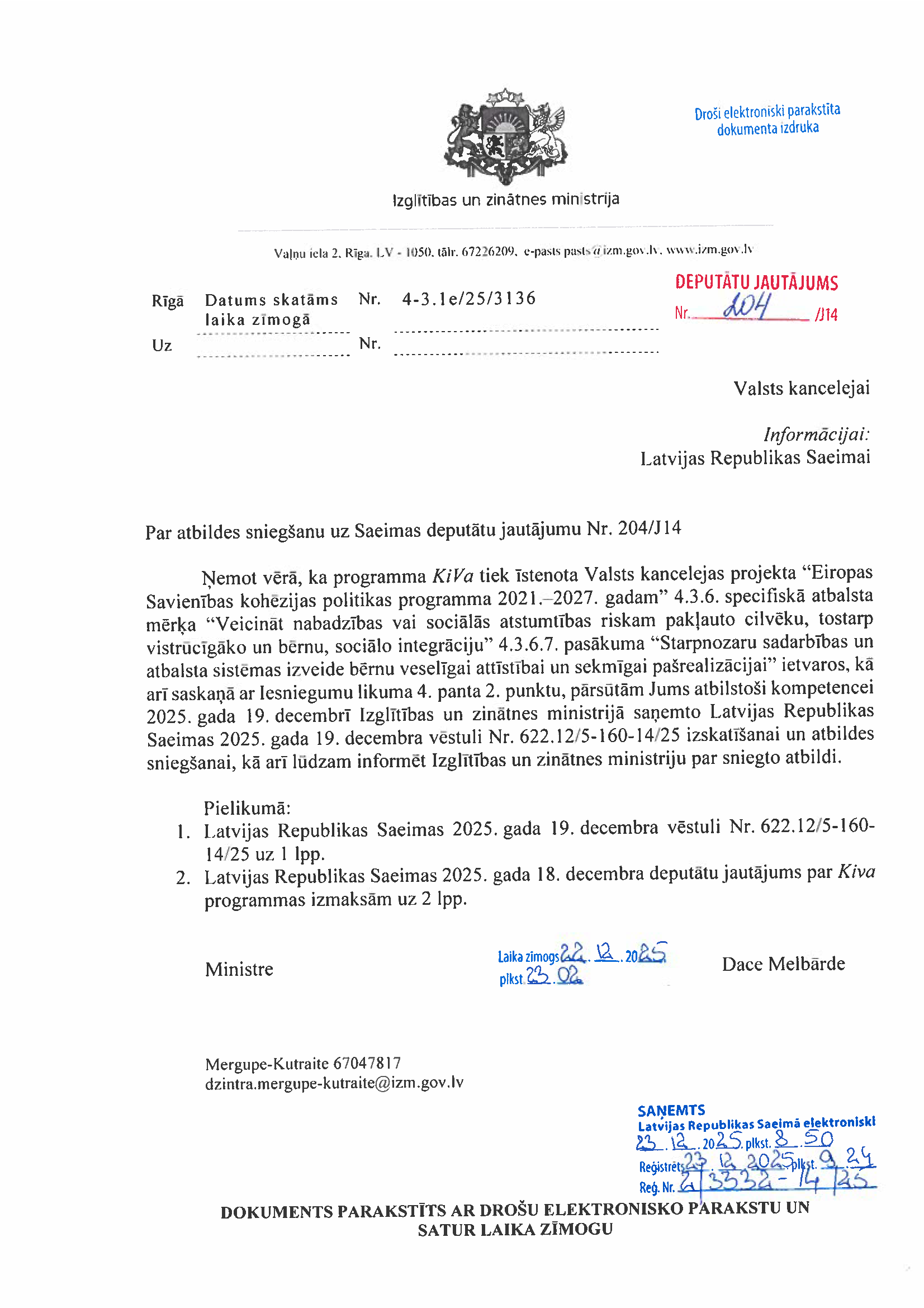 Jautājums tiek nodots Ministru prezidentei atbildes sniegšanai.