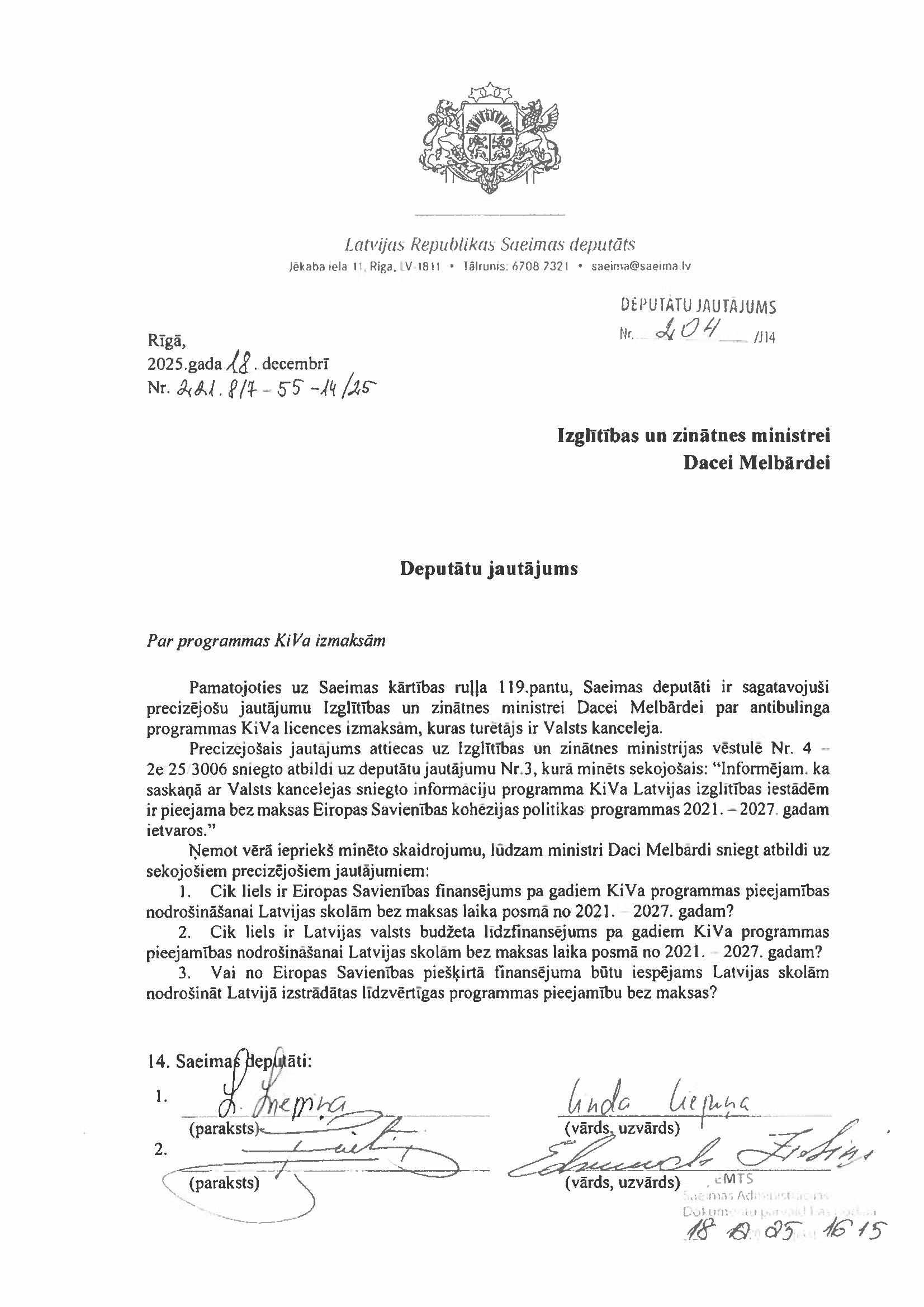 Deputāti Linda Liepiņa, Edmunds Zivtiņš, Kristaps Krištopans, Ričards Šlesers un Ilze Stobova ir iesnieguši jautājumu izglītības un zinātnes ministrei Dacei Melbārdei "Par Vienotās skolas ieviešanas ietekmi uz izglītības kvalitāti un saliedētību, kā arī reformas praktisko īstenošanu skolās". Jautājums tiek nodots ministrei atbildes sniegšanai.