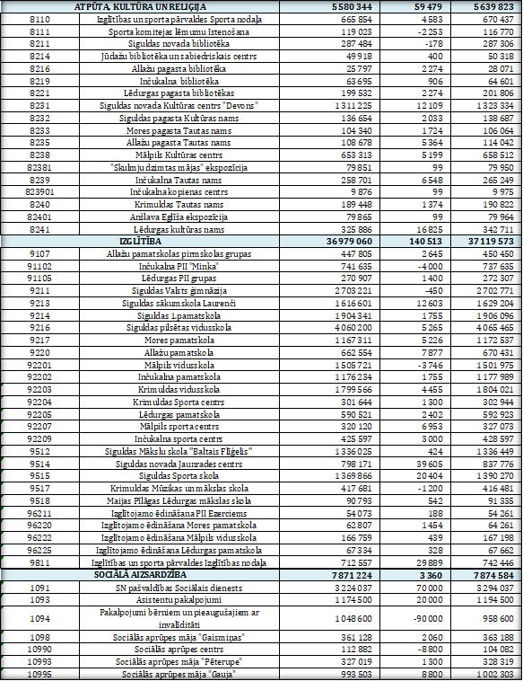 - 28 475 euro palielināti ieņēmumi no Latvijas Nacionālā kultūras centra saņemta dotācija Siguldas novada māksliniecisko kolektīvu vadītāju darba samaksai un VSAOI;