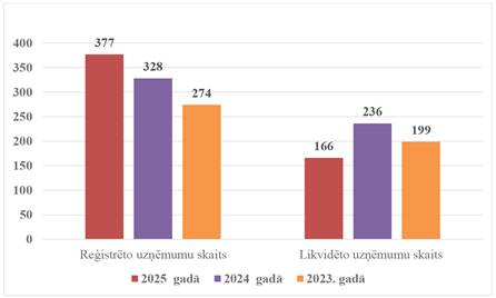 2025. gadā, saskaņā ar Lursoft datiem, Mārupes novadā reģistrēti 377 jauni uzņēmumi, savukārt likvidēti 166 uzņēmumi. Likvidēto uzņēmumu skaits, salīdzinot ar iepriekšējo gadu, ir būtiski samazinājies. Vienlaikus saglabājas pozitīva tendence – jauno uzņēmumu skaits Mārupes novada pašvaldībā jau sesto gadu pēc kārtas pārsniedz likvidēto uzņēmumu skaitu.