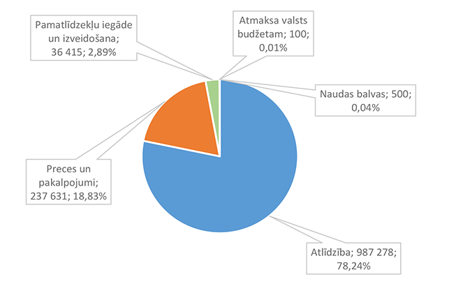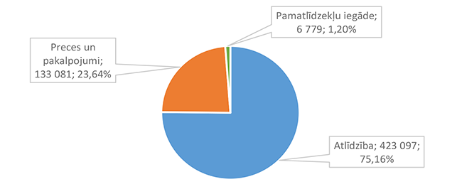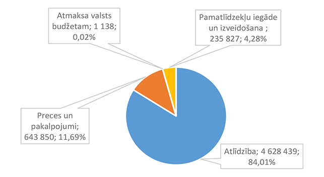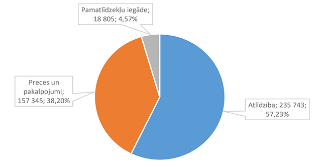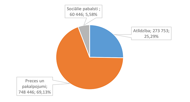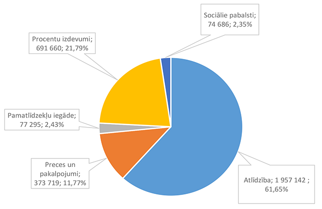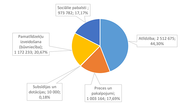 Lielākais īpatsvars ir izdevumiem atlīdzības nodrošināšanai 2 512 675 EUR, kas ir 44,30 % no sociālai aizsardzībai 2026. gadam plānotā finansējuma.