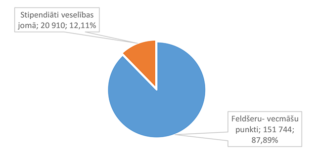 Sociālās aizsardzības 2026. gada finansējuma sadalījums pa pakalpojuma veidiem, (euro, %)