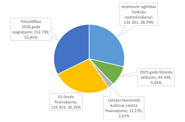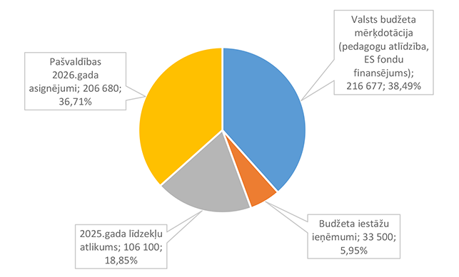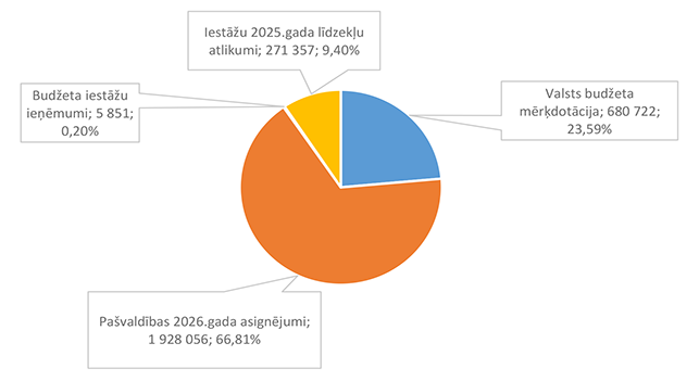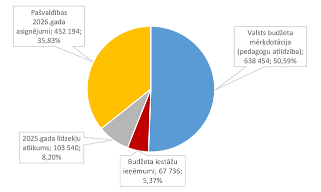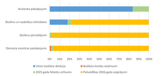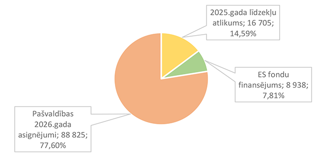 Lielākais īpatsvars ir pašvaldības 2026. gada asignējumiem 88 825 EUR, kas ir 77,60 % no Izglītības pārvaldei 2026. gada plānotā finansējuma.