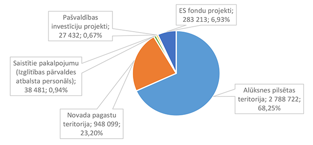 Lielākais īpatsvars ir pašvaldības asignējumi 152 739 EUR, kas ir 32,45 % no pārējo citur neklasificēto izglītības pakalpojumiem 2026. gadam plānotā finansējuma, otrā pozīcijā ir ieņēmumi izglītības funkciju nodrošināšanai (Latvijas pašvaldību maksājumi par viņu teritorijā deklarētiem skolēniem, kuri apmeklē Alūksnes novada izglītības iestādes) 135 261 EUR, kas ir 28,74 % no pārējiem citur neklasificētiem izglītības pakalpojumiem 2026. gadam plānotā finansējuma.