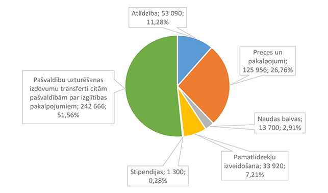 Lielākais īpatsvars ir preču iegādei un pakalpojumu nodrošināšanai 748 446 EUR, kas ir 69,13 % no papildu izglītības pakalpojumu 2026. gadam plānotā finansējuma. Izdevumu pozīcijā "Sociālie pabalsti" iekļauti izdevumi par sabiedriskā (vietējās reģionālās nozīmes maršrutos un/vai starppilsētu maršrutos) transporta pakalpojumiem un kompensācijas vecākiem par izglītojamo nogādāšanu ar personīgo autotransportu līdz tuvākai sabiedriskā transporta pieturai vai izglītības iestādei saistošajos noteikumos noteiktajos gadījumos.