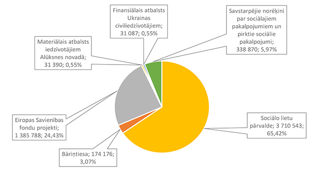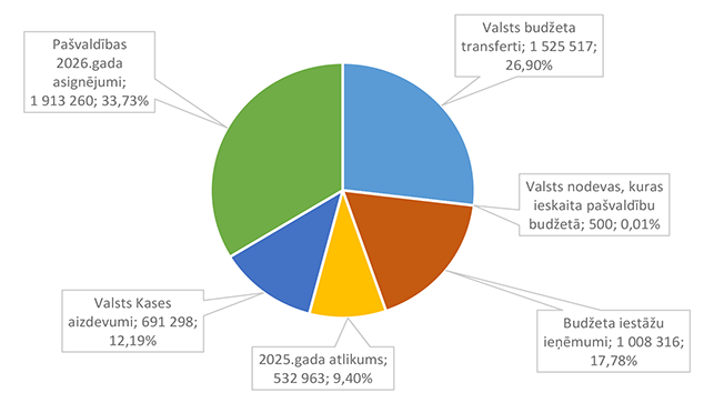 Lielākais īpatsvars ir pašvaldības 2026. gada asignējumiem 1 913 260 EUR, kas ir 33,73 % no sociālai aizsardzībai 2026. gadam plānotā finansējuma, otrā pozīcijā ir valsts budžeta transferti 1 525 517 EUR, kas ir 26,90 % no sociālai aizsardzībai 2026. gadam plānotā finansējuma.