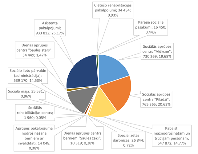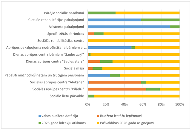 Lielākais īpatsvars ir asistenta pakalpojumiem 933 812 EUR, kas ir 25,17 % no Sociālo lietu pārvaldei 2026. gadam plānotā finansējuma. Otrie pēc īpatsvara ir izdevumi sociālās aprūpes centra "Pīlādži" darba nodrošinājumam 730 269 EUR, kas ir 19,68 % no Sociālo lietu pārvaldei 2026. gadam plānotā finansējuma. Izdevumi pabalstiem maznodrošinātām un trūcīgām personām sastāda 547 872 EUR, kas ir 14,77 % no Sociālo lietu pārvaldei 2026. gadam plānotā finansējuma.