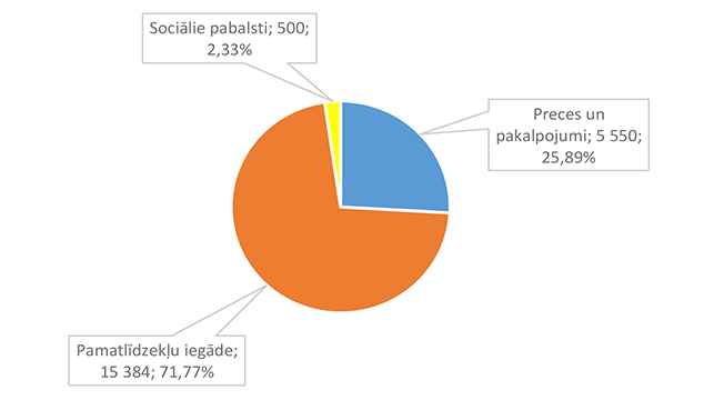 Lielākais īpatsvars ir izdevumiem pamatlīdzekļu iegādei 15 384 EUR, kas ir 71,77 % no ziedojumiem un dāvinājumiem 2026. gadam plānotā finansējuma.