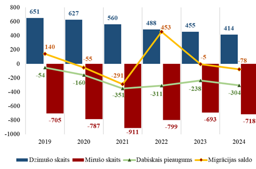 1.1. attēls. Iedzīvotāju dabiskā un mehāniskā kustība Jelgavas valstspilsētā 2019.–2024.