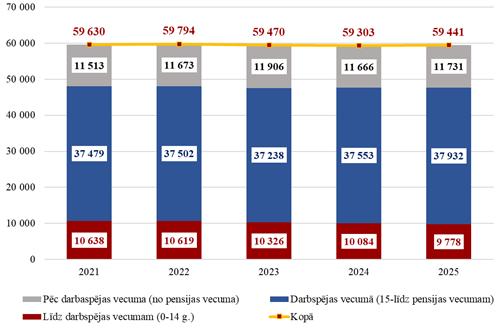 1.3. attēls. Iedzīvotāju skaits un vecumstruktūra Jelgavā 2021.-2025.