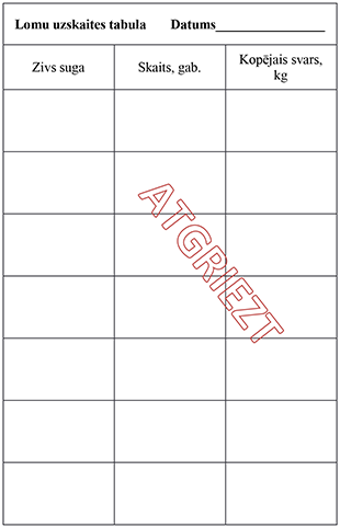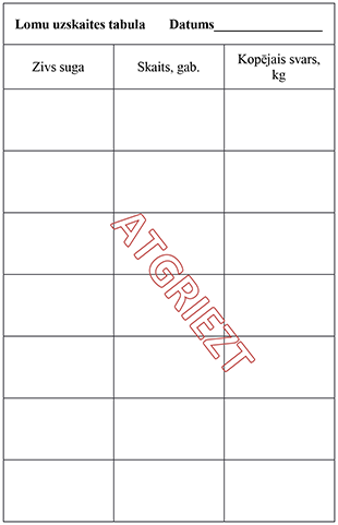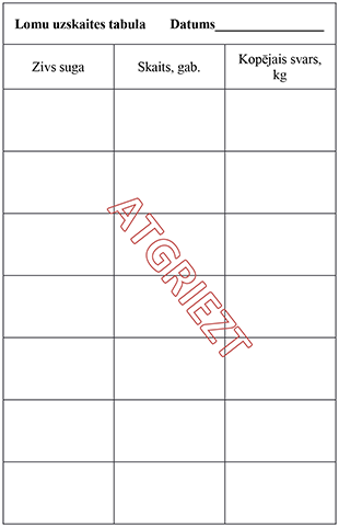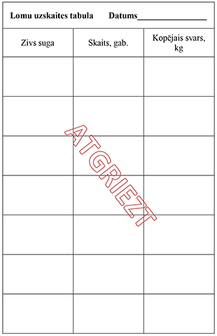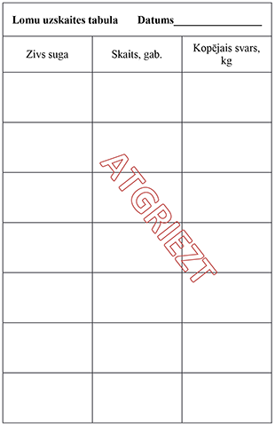 25.2. gada bezmaksas licencē makšķerēšanai – lomu uzskaites tabulā, atbilstoši licencē norādītajam paraugam;