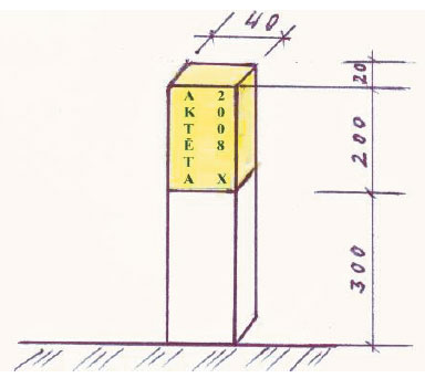 Koka mietiņš (izmēri brīdinājuma zīmei milimetros) ar dzeltenā krāsā nokrāsotu augšējo daļu un aktēšanas datumu.