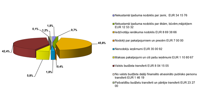 – ieņēmumi no valsts budžeta un valsts budžeta daļēji finansēto atvasināto publisko personu un budžeta nefinansēto iestāžu transfertu pārskaitījumiem 8 056 124 euro (42,45 %);