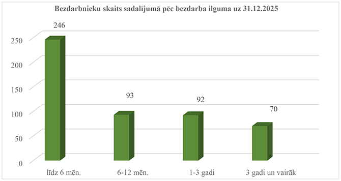 Uz 2025. gada 31. decembri no Preiļu novadā reģistrēto bezdarbnieku kopskaita 246 jeb 49,11 % bija ar bezdarba ilgumu līdz 6 mēnešiem. 93 bezdarbnieki jeb 18,56 % neatrodas darba tiesiskajās attiecībās 6–12 mēnešus, 92 bezdarbniekiem jeb 18,36 % bezdarbs ilgst 1–3 gadus, savukārt 70 bezdarbnieki jeb 13,97 % atrodas bezdarbnieka statusā 3 un vairāk gadus (skatīt 2. attēlu). 2025. gadā salīdzinoši ar atbilstošo periodu 2024. gadā, palielinājās to bezdarbnieku skaits, kuri darba tiesiskajās attiecībās neatrodas līdz 6 mēnešiem, bet samazinājies bezdarbnieku skaits, kas šajā statusā atrodas 6 līdz 12 mēnešus. Bezdarbnieku skaits, kuru bezdarbs ilgst 1–3 gadus ir samazinājies par 5, savukārt to bezdarbnieku skaits, kas neatrodas darba tiesiskajās attiecības 3 un vairāk gadus ir samazinājies par 17 bezdarbniekiem salīdzinot ar attiecīgo periodu 2024. gadā.