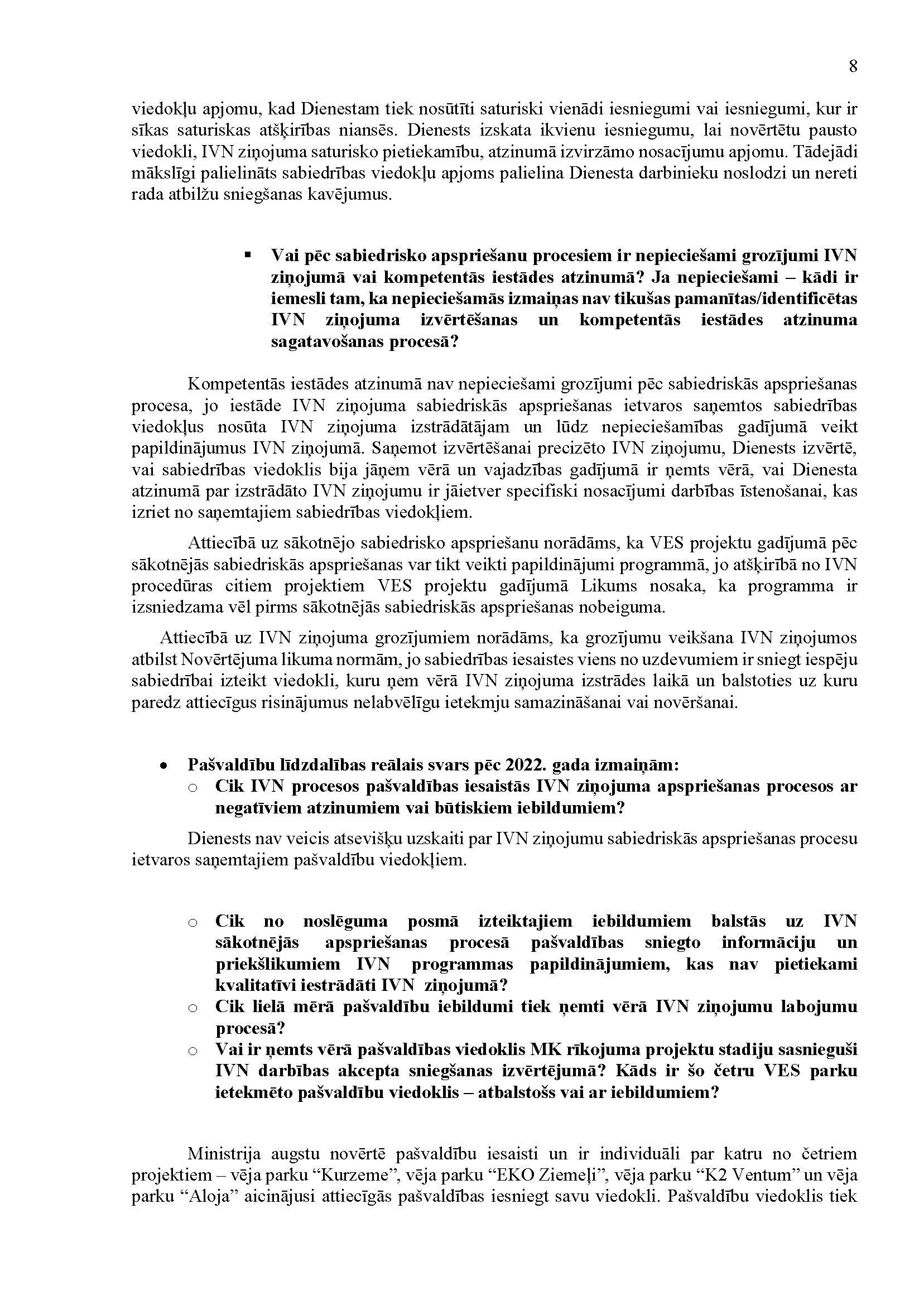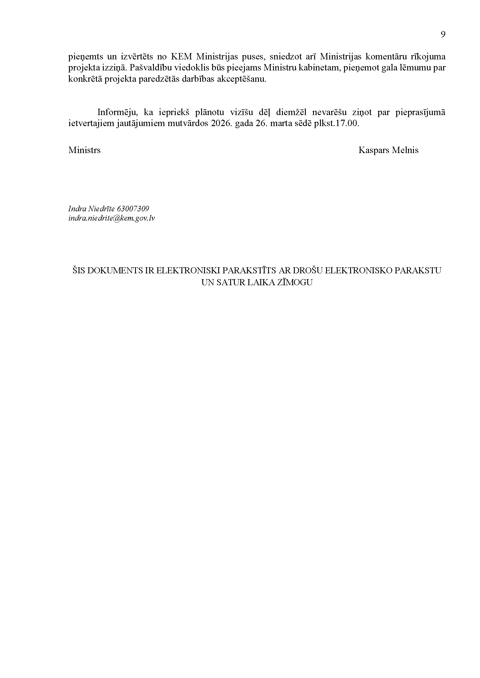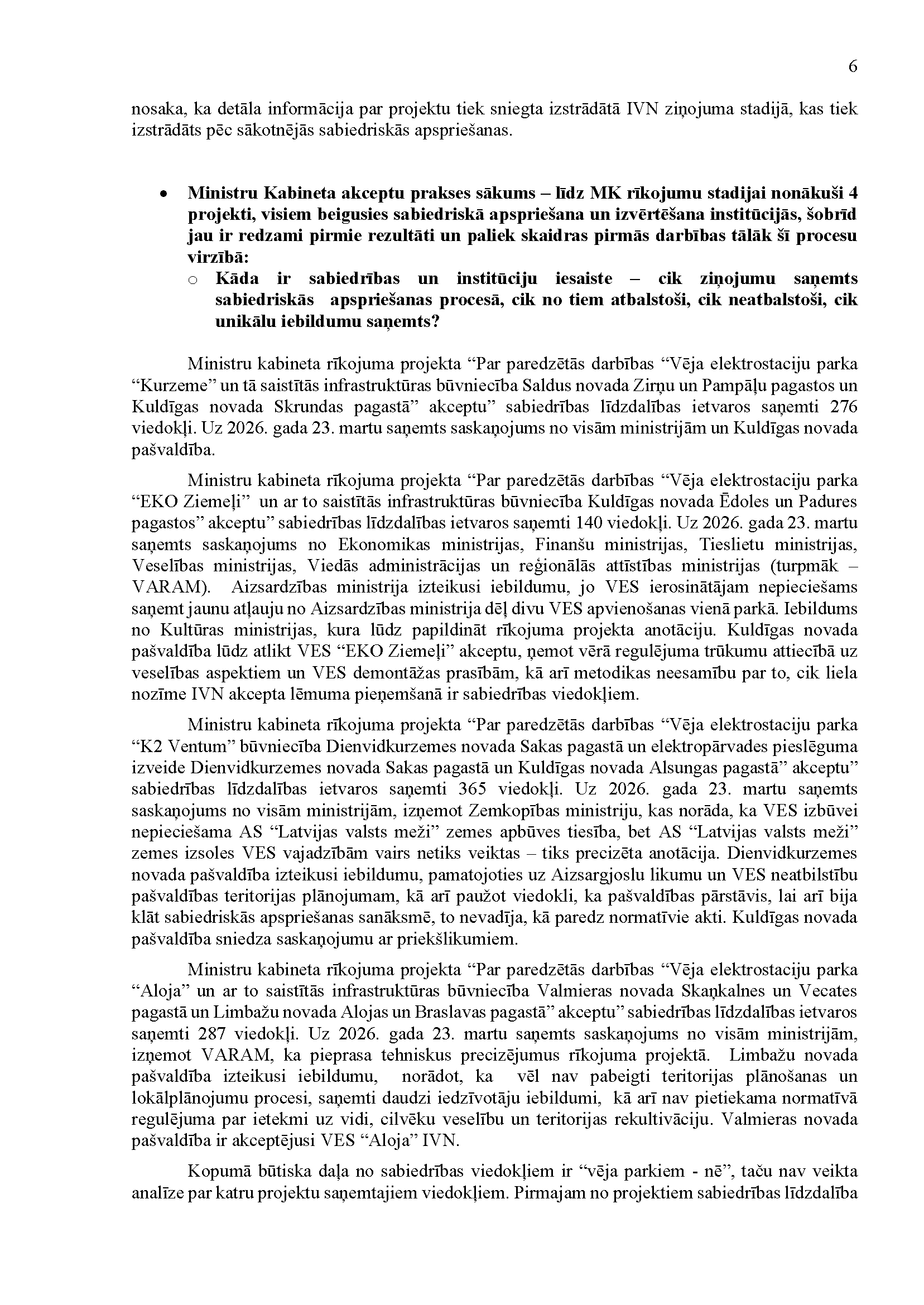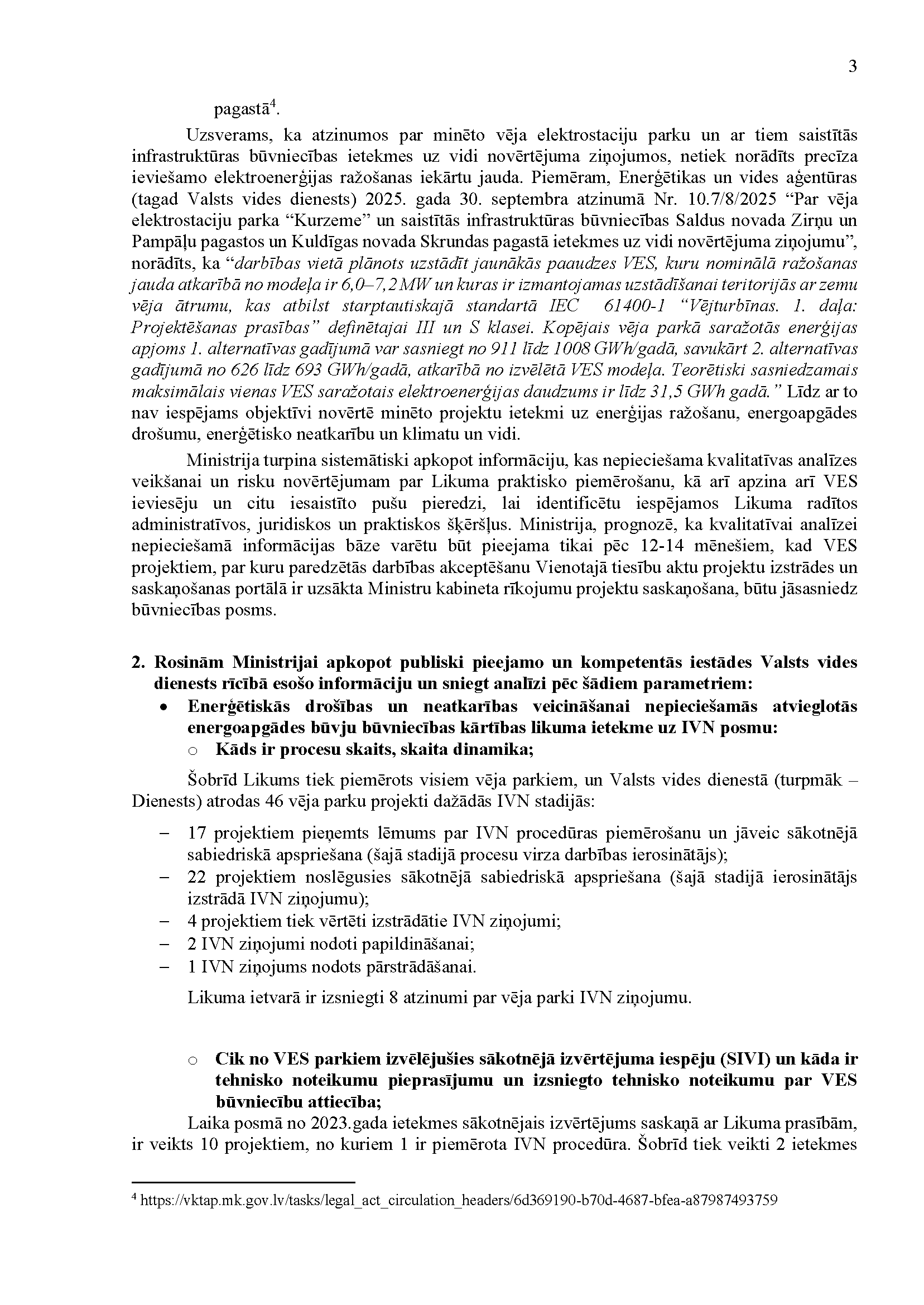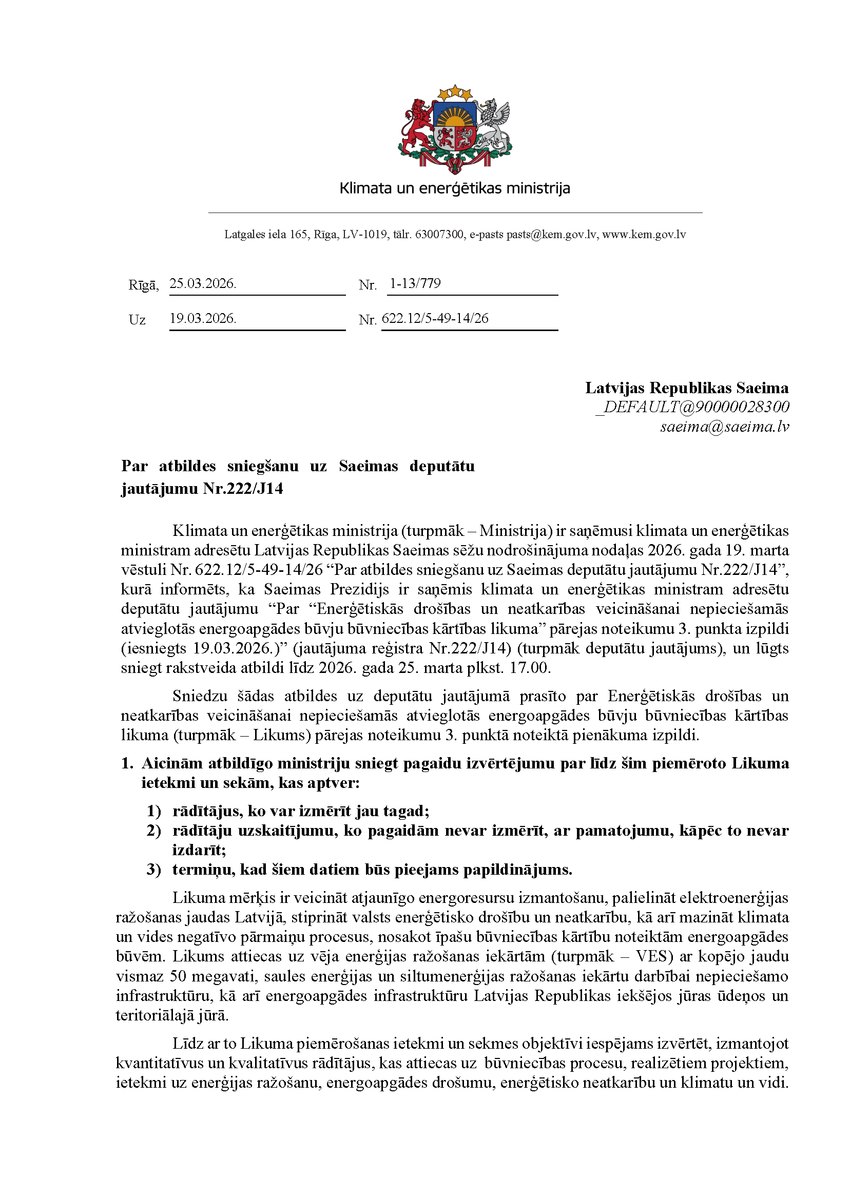 Deputātu Jura Viļuma, Lindas Matisones, Česlava Batņas, Edgara Tavara un Aivas Vīksnas jautājums klimata un enerģētikas ministram Kasparam Melnim "Par Enerģētiskās drošības un neatkarības veicināšanai nepieciešamās atvieglotās energoapgādes būvju būvniecības kārtības likuma pārejas noteikumu 3. punkta izpildi". Jautājums tika iesniegts 19. martā. Saņemtā rakstveida atbilde iesniedzējus neapmierina. Ministrs informē, ka nevar ierasties sniegt mutvārdu atbildi iepriekš saplānotā darba grafika dēļ.