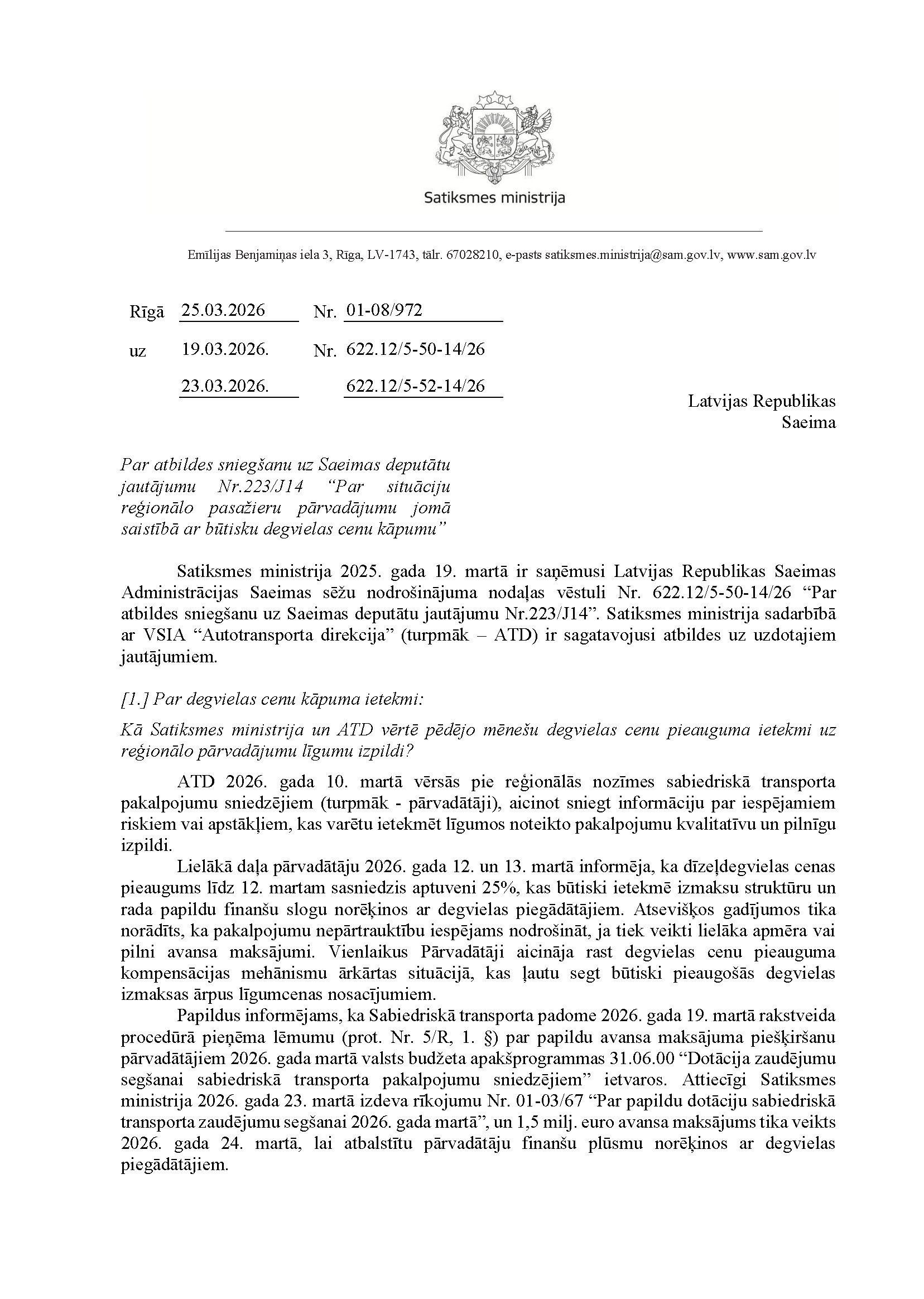 Deputātu Viktorijas Pleškānes, Jekaterinas Drelingas, Jeļenas Kļaviņas, Ričarda Šlesera un Kristapa Krištopana jautājums satiksmes ministram Atim Švinkam "Par situāciju reģionālo pasažieru pārvadājumu jomā saistībā ar būtisku degvielas cenu kāpumu". Jautājums tika iesniegts 19. martā. Saņemtā rakstveida atbilde iesniedzējus neapmierina. Ministrs informē, ka nevar ierasties sniegt mutvārdu atbildi iepriekš saplānotā darba grafika dēļ.