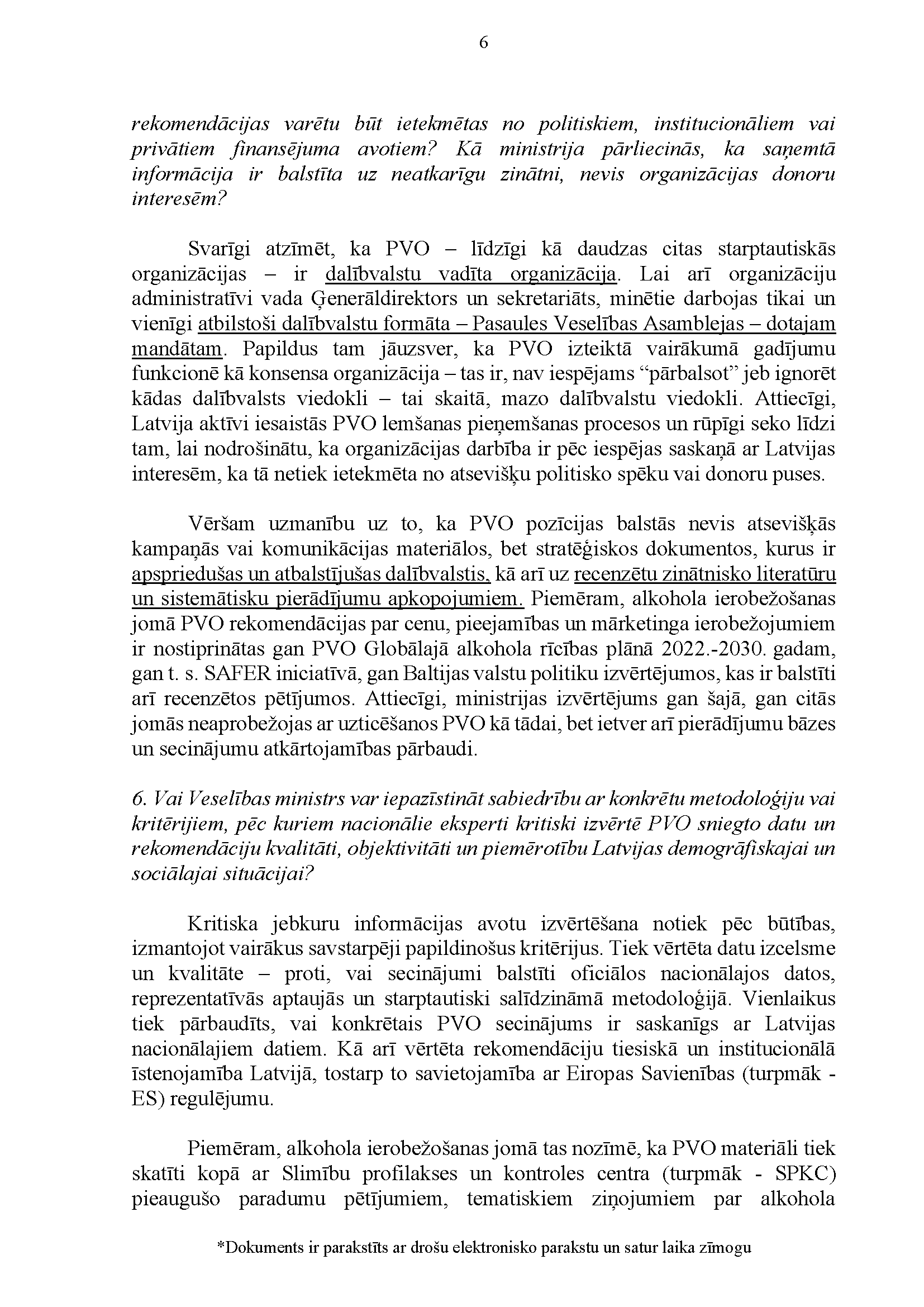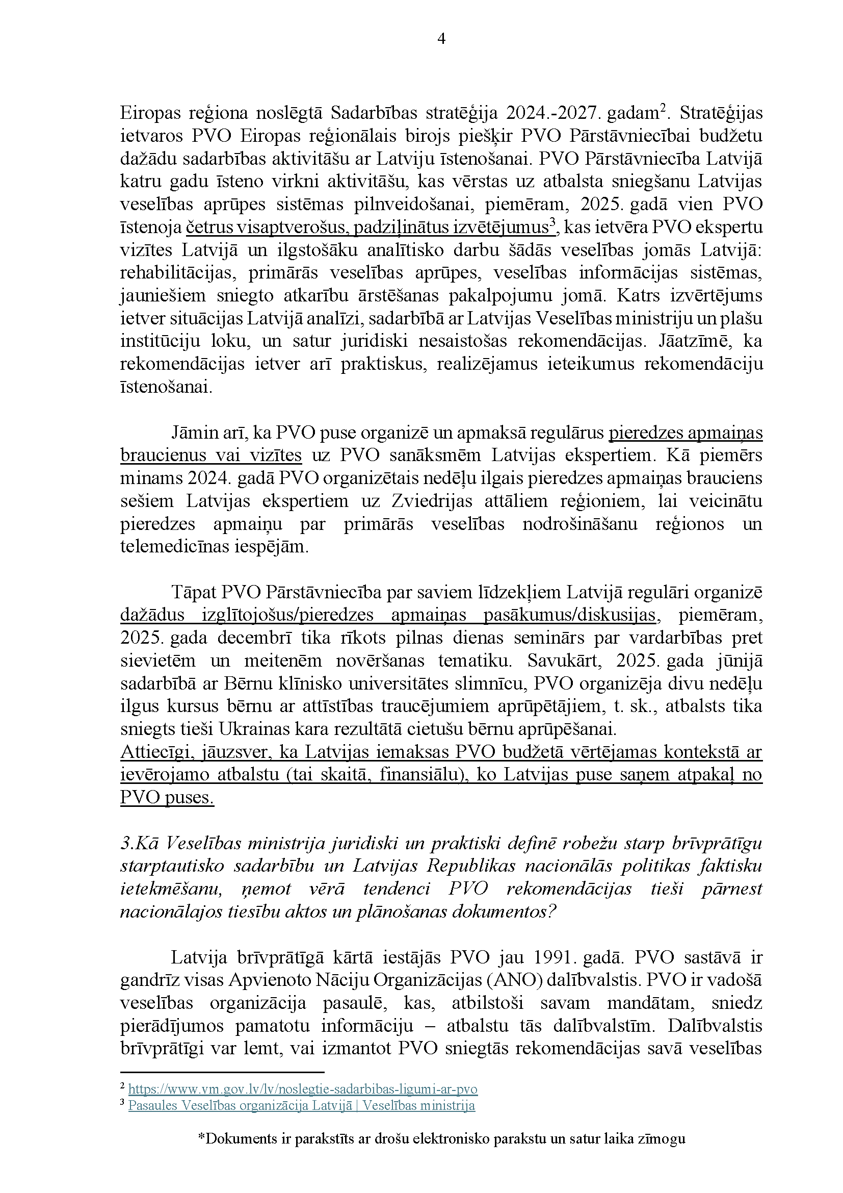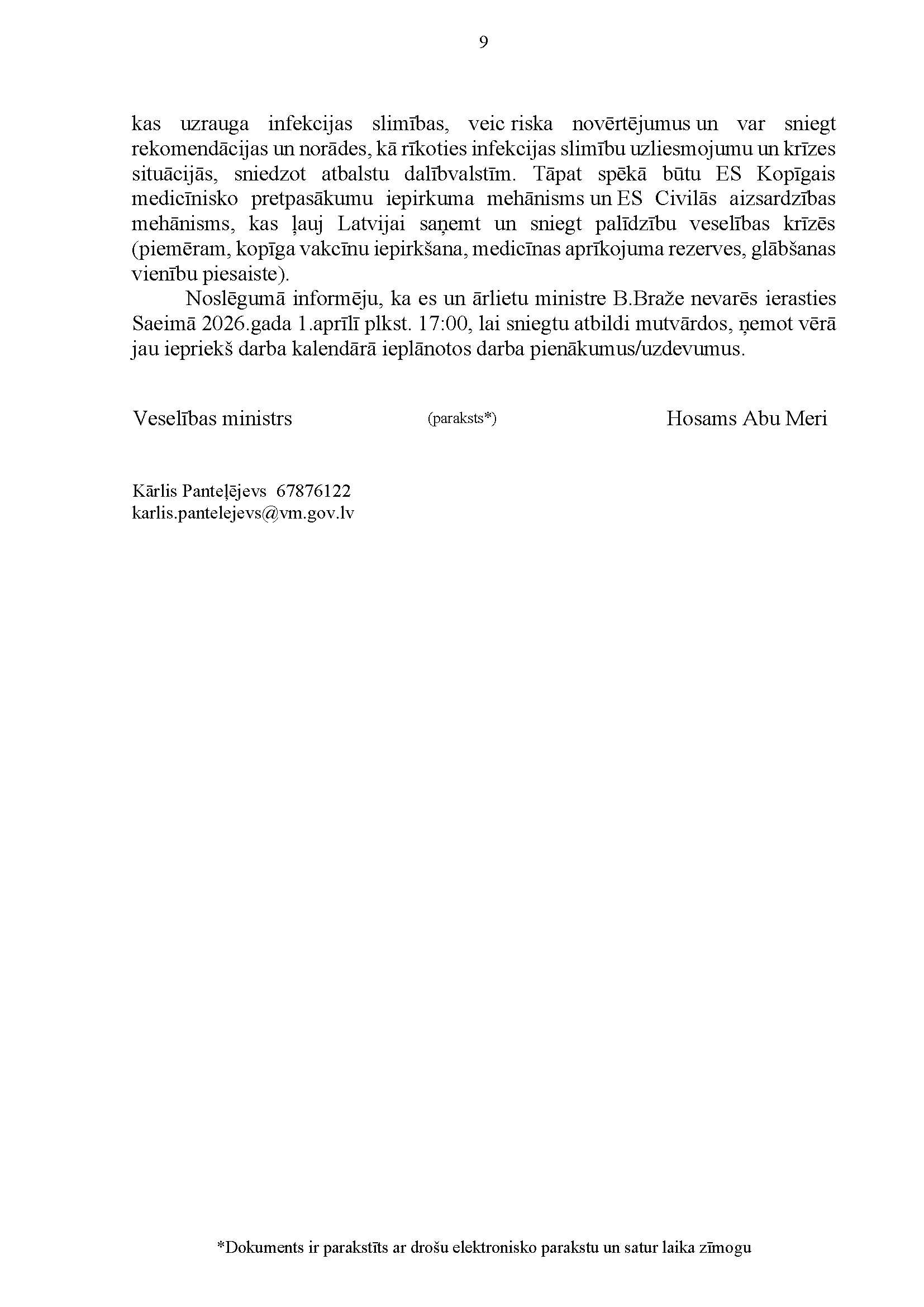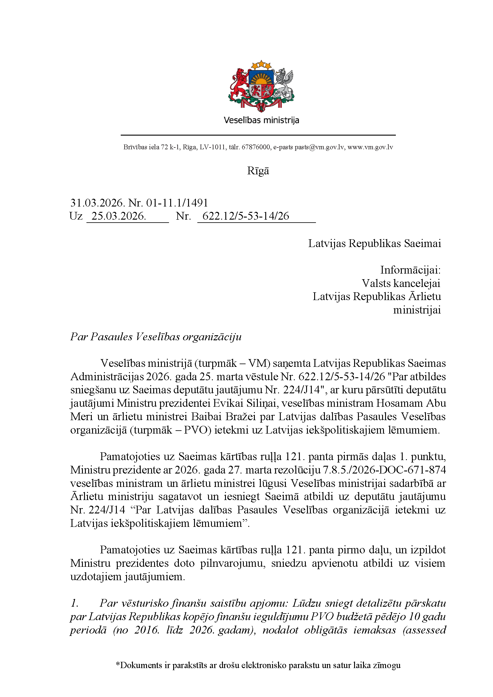 Deputātu Edmunda Zivtiņa, Viktorijas Pleškānes, Maijas Armaņevas, Ilzes Stobovas un Lindas Liepiņas jautājums Ministru prezidentei Evikai Siliņai, ārlietu ministrei Baibai Bražei un veselības ministram Hosamam Abu Meri "Par Latvijas dalības Pasaules Veselības organizācijā ietekmi uz Latvijas iekšpolitiskajiem lēmumiem". Jautājums tika iesniegts 25. martā. Ministru prezidente Evika Siliņa viņai uzdotos jautājumus ir pāradresējusi veselības ministram Hosamam Abu Meri sadarbībā ar ārlietu ministri Baibu Braži atbildes sniegšanai. Saņemtā rakstveida atbilde iesniedzējus neapmierina. Ministri informē, ka nevar ierasties sniegt mutvārdu atbildes iepriekš darba kalendārā plānoto darba pienākumu un uzdevumu dēļ.