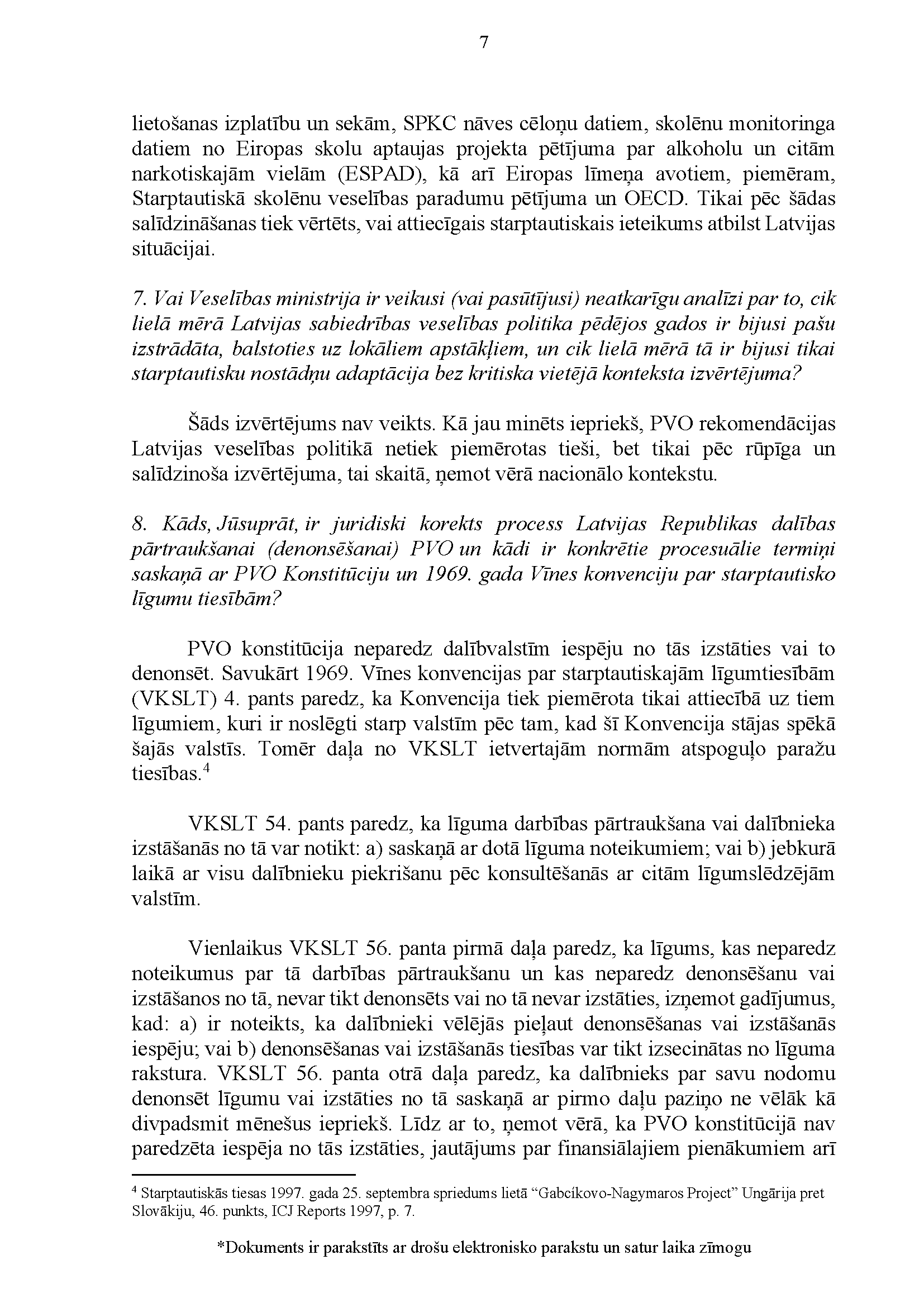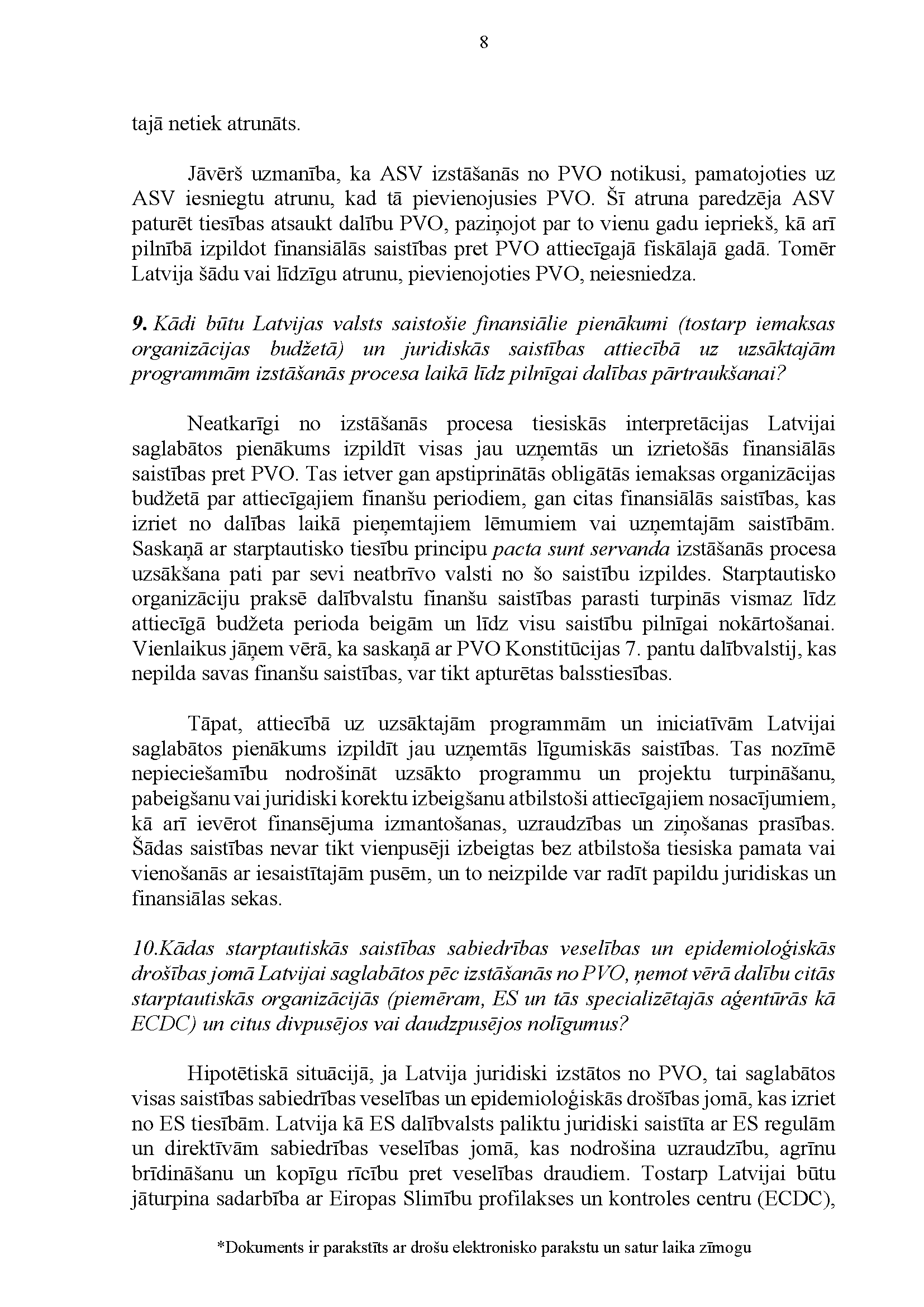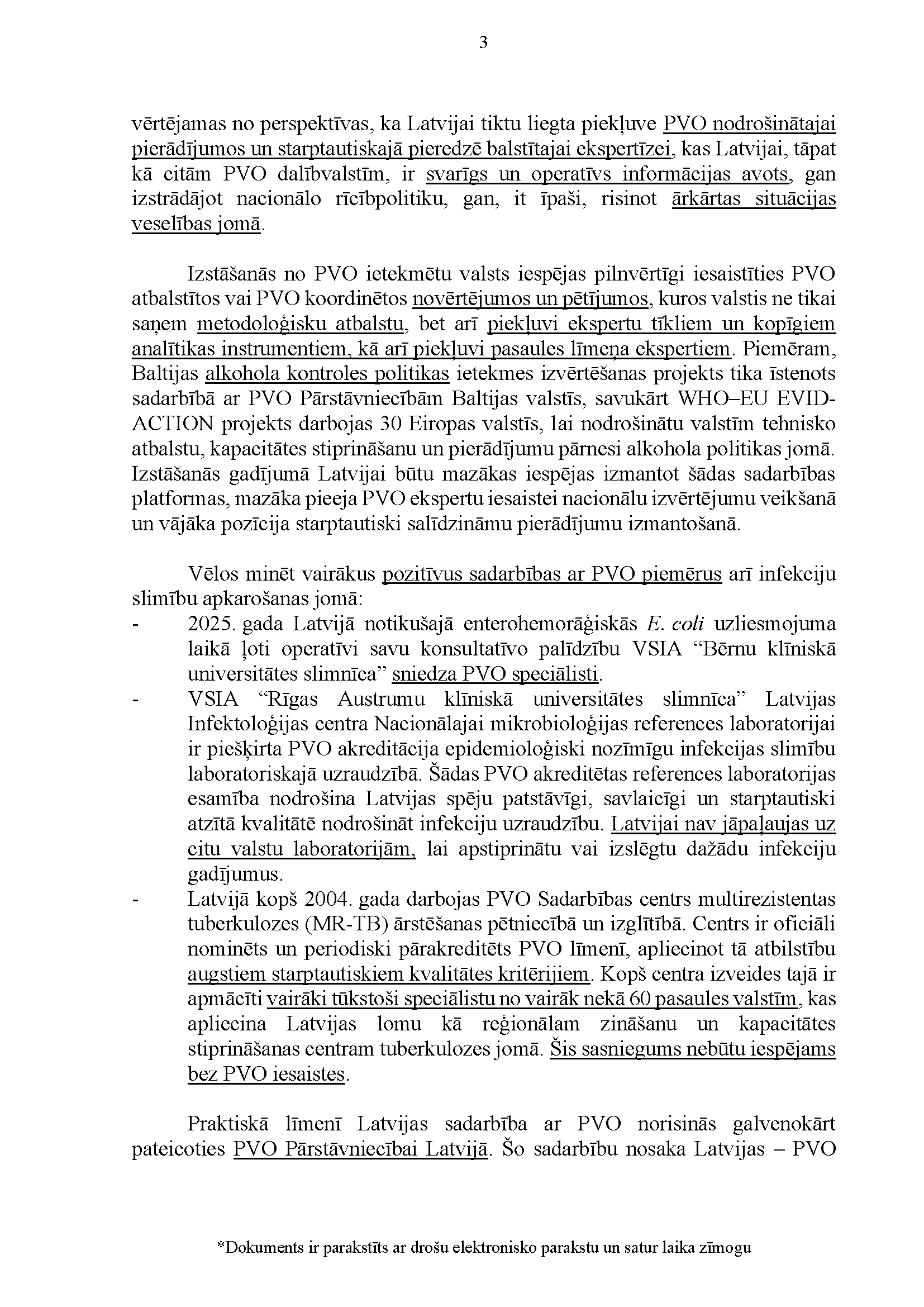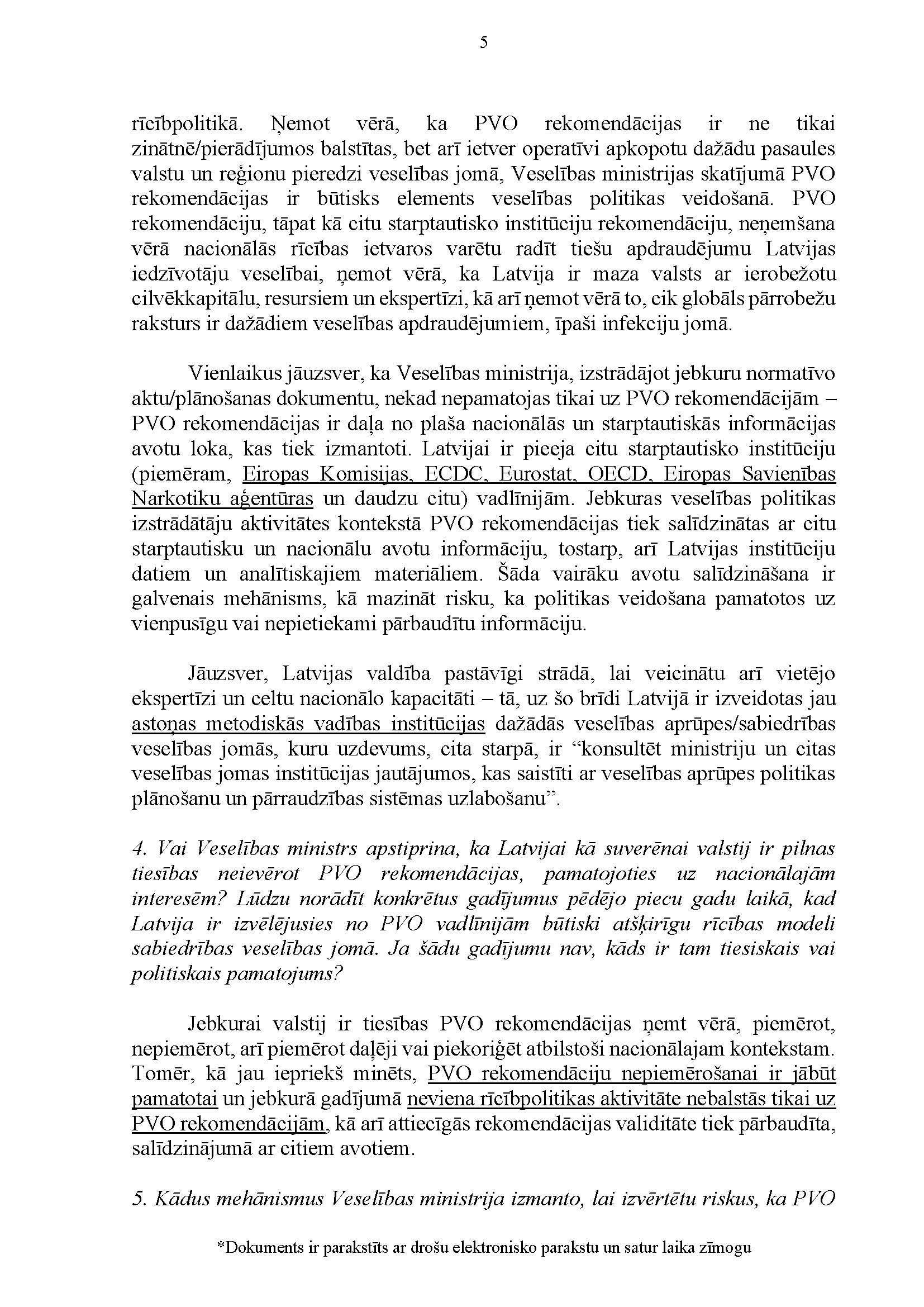 Deputātu Edmunda Zivtiņa, Viktorijas Pleškānes, Maijas Armaņevas, Ilzes Stobovas un Lindas Liepiņas jautājums Ministru prezidentei Evikai Siliņai, ārlietu ministrei Baibai Bražei un veselības ministram Hosamam Abu Meri "Par Latvijas dalības Pasaules Veselības organizācijā ietekmi uz Latvijas iekšpolitiskajiem lēmumiem". Jautājums tika iesniegts 25. martā. Ministru prezidente Evika Siliņa viņai uzdotos jautājumus ir pāradresējusi veselības ministram Hosamam Abu Meri sadarbībā ar ārlietu ministri Baibu Braži atbildes sniegšanai. Saņemtā rakstveida atbilde iesniedzējus neapmierina. Ministri informē, ka nevar ierasties sniegt mutvārdu atbildes iepriekš darba kalendārā plānoto darba pienākumu un uzdevumu dēļ.