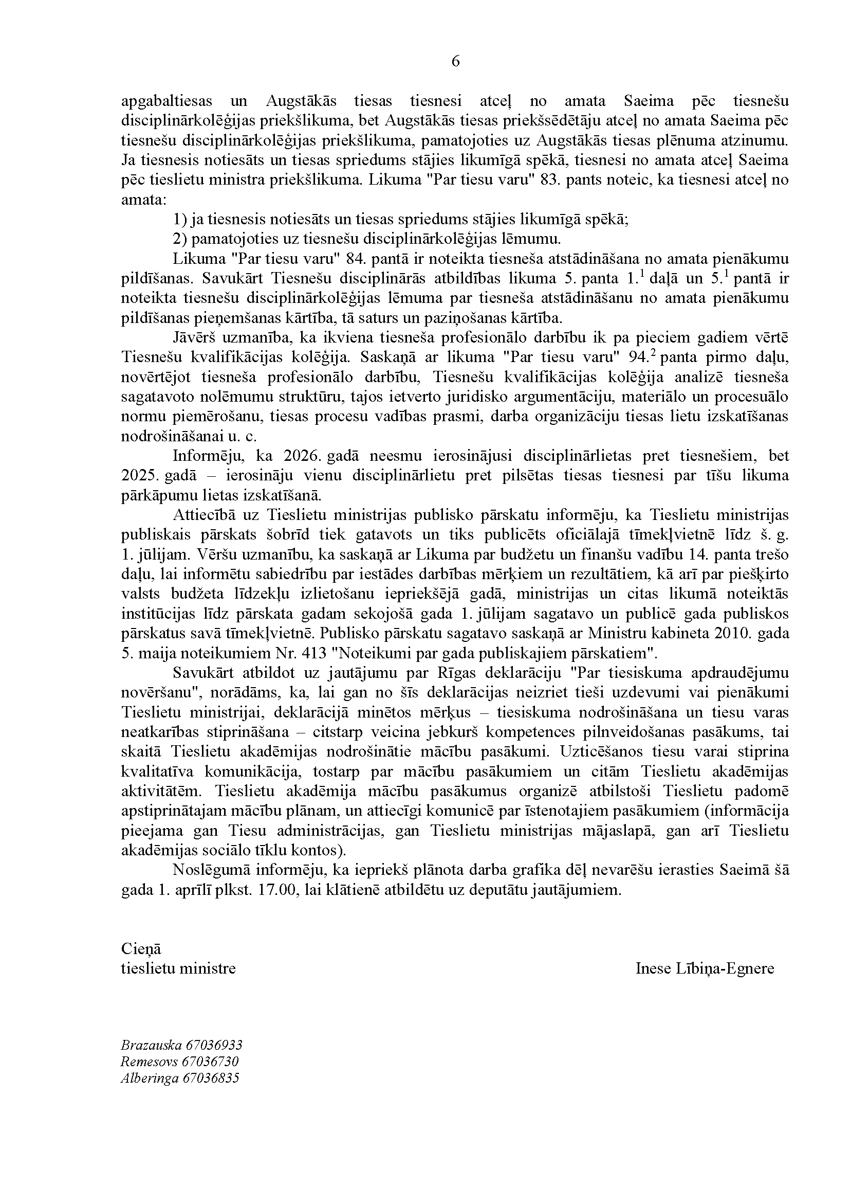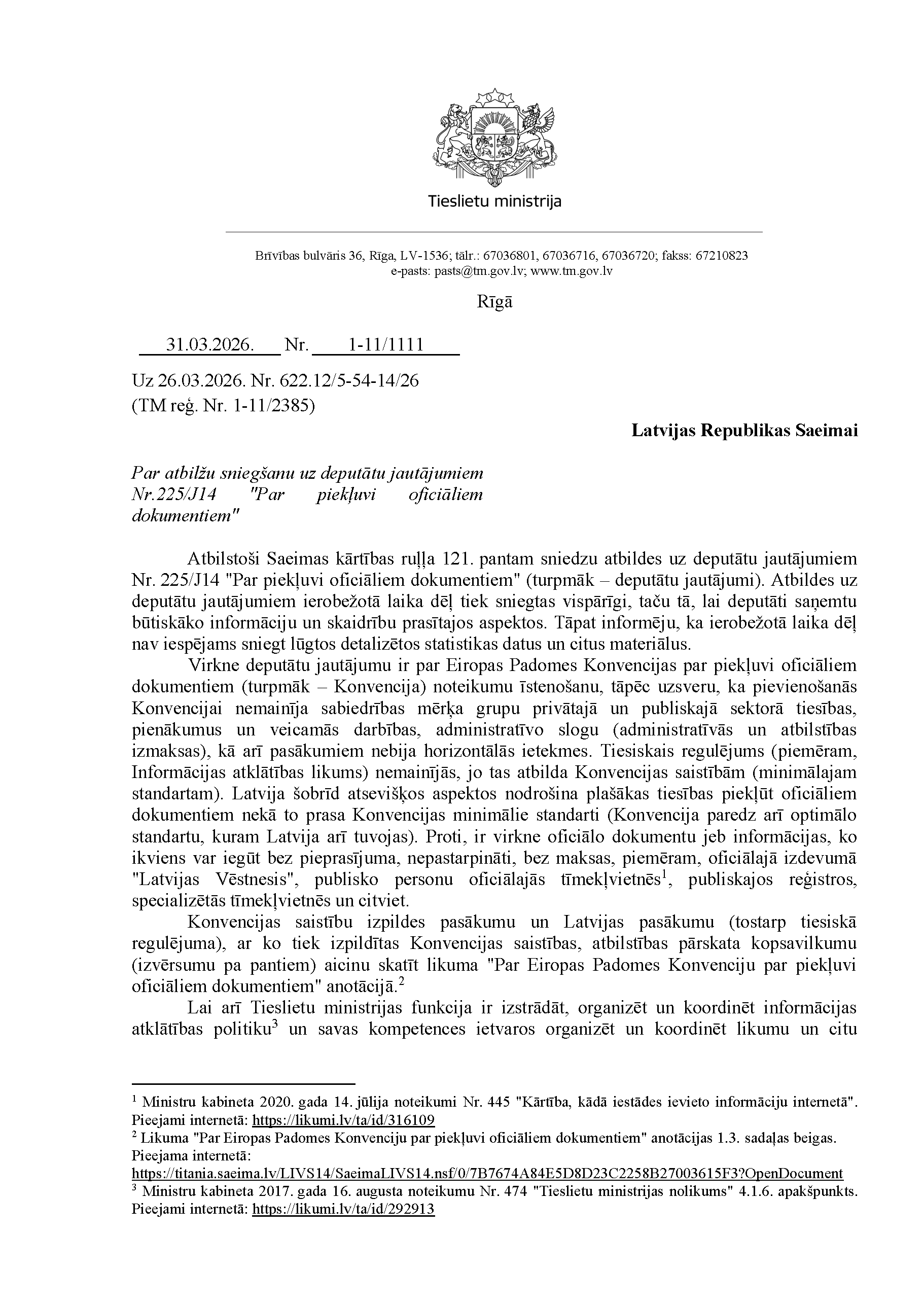 Deputātu Viktorijas Pleškānes, Edmunda Zivtiņa, Lindas Liepiņas, Maijas Armaņevas, Ramonas Petravičas un Jekaterinas Drelingas jautājums tieslietu ministrei Inesei Lībiņai-Egnerei "Par piekļuvi oficiāliem dokumentiem". Jautājums iesniegts 26. martā. Saņemtā rakstveida atbilde iesniedzējus neapmierina. Ministre informē, ka nevar ierasties un sniegt mutvārdu atbildi iepriekš plānotā darba grafika dēļ.
