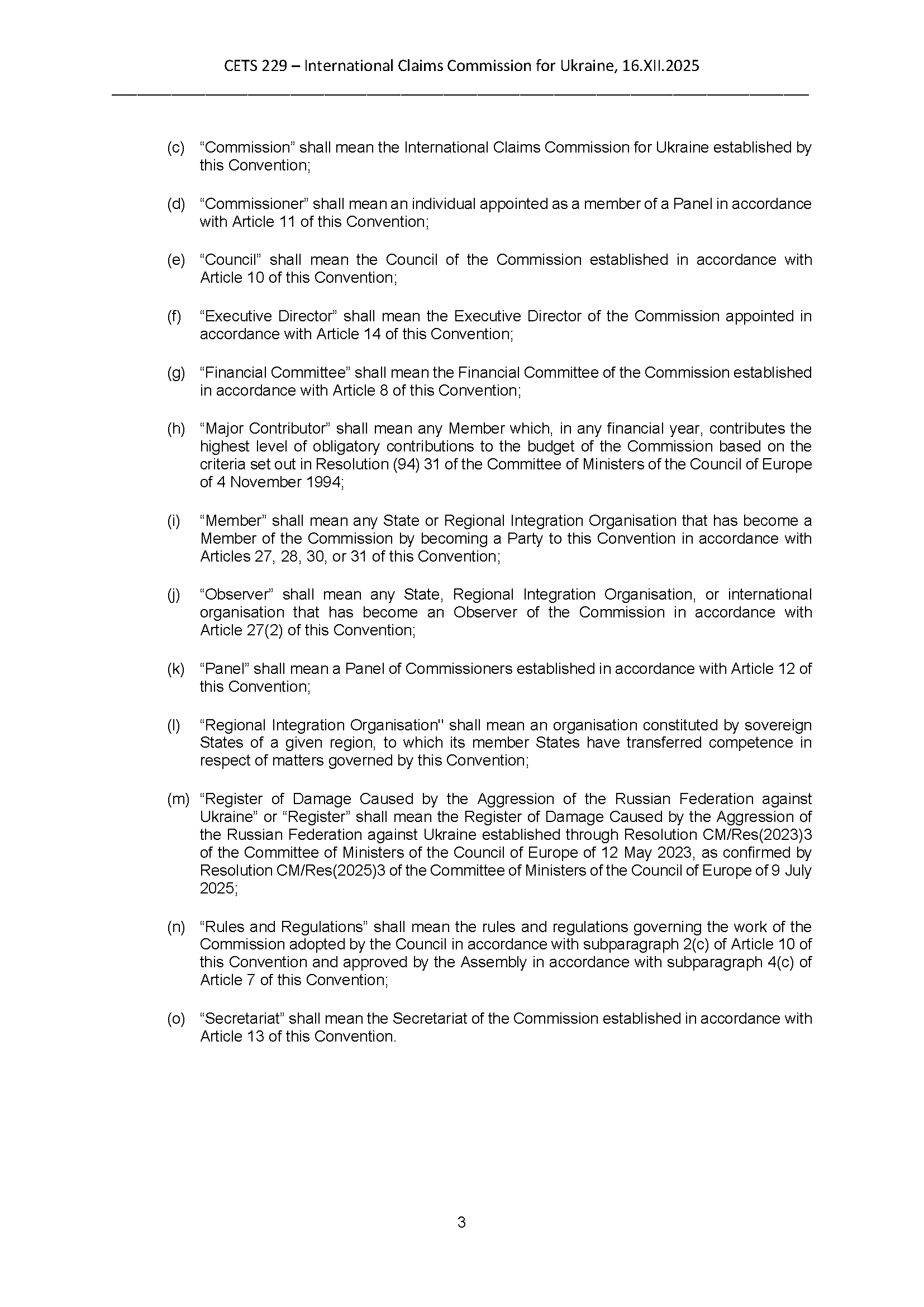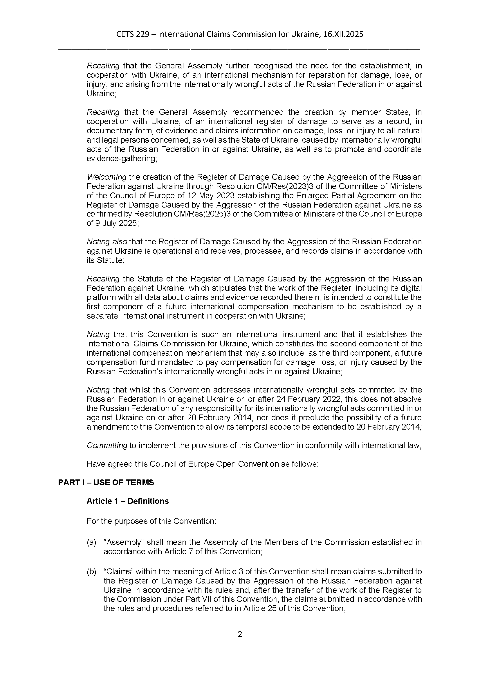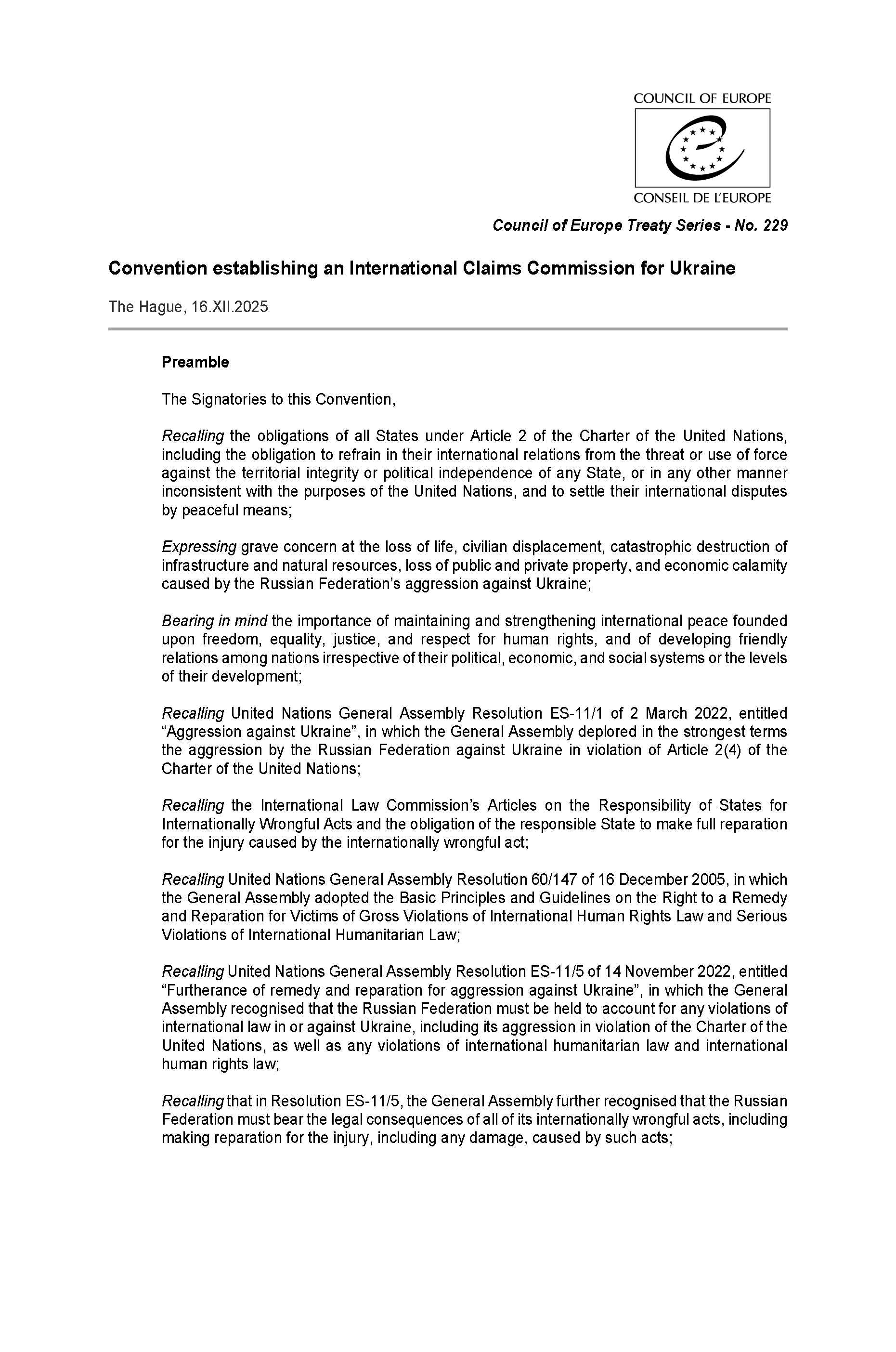 atzīmējot, ka šī konvencija ir šāds starptautisks dokuments un ka ar to tiek izveidota Starptautiskā Prasību komisija Ukrainai, kas ir starptautiskā kompensācijas mehānisma otrais elements, un kurā kā trešo elementu var iekļaut arī turpmāku kompensāciju fondu, kam uzdots izmaksāt kompensācijas par zaudējumiem, kaitējumu vai aizskārumu, ko radījušas Krievijas Federācijas starptautiski prettiesiskās darbības Ukrainā vai pret Ukrainu;