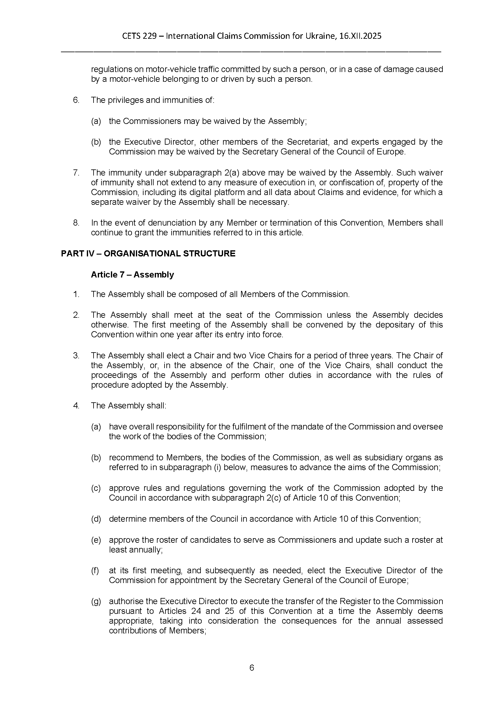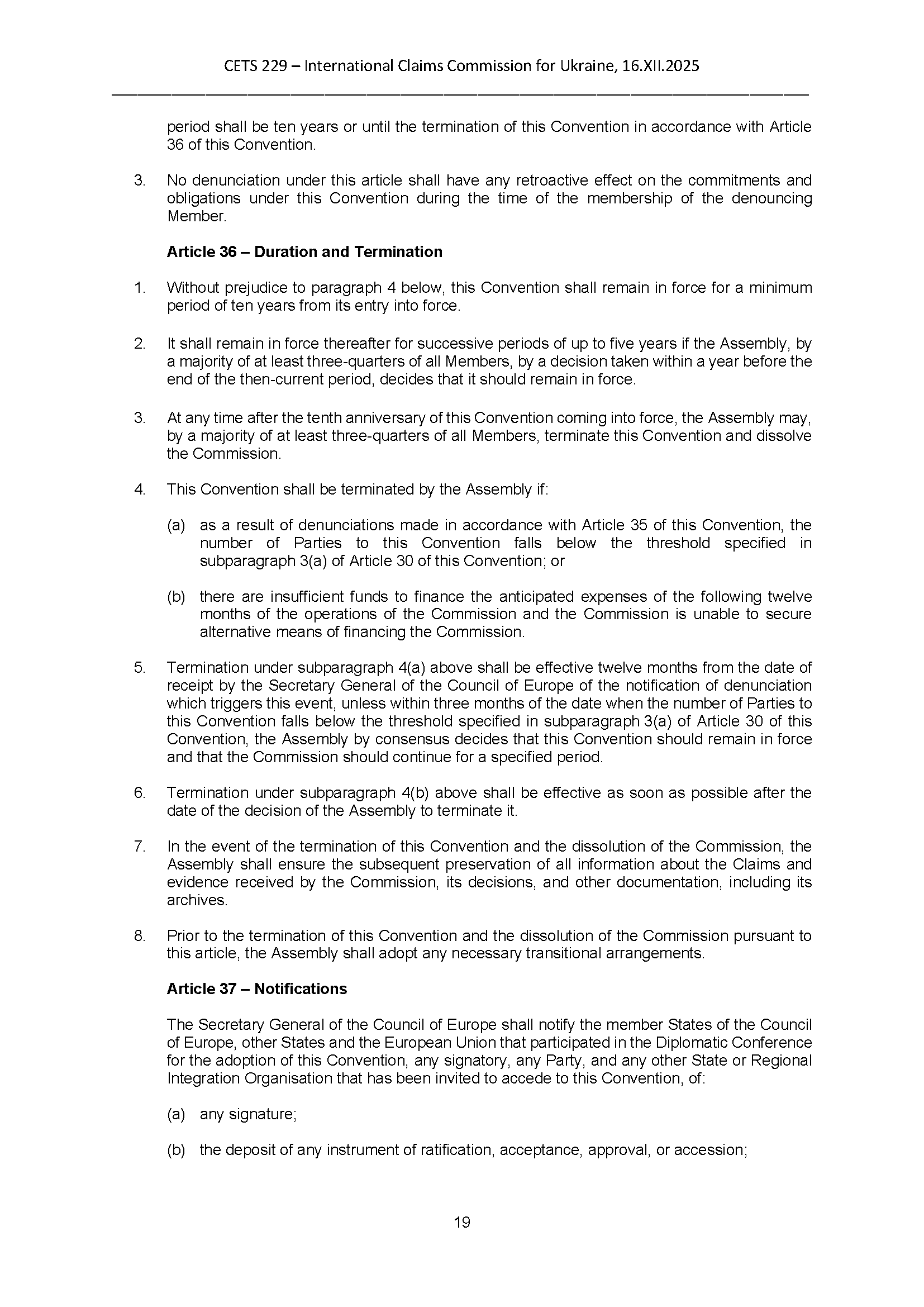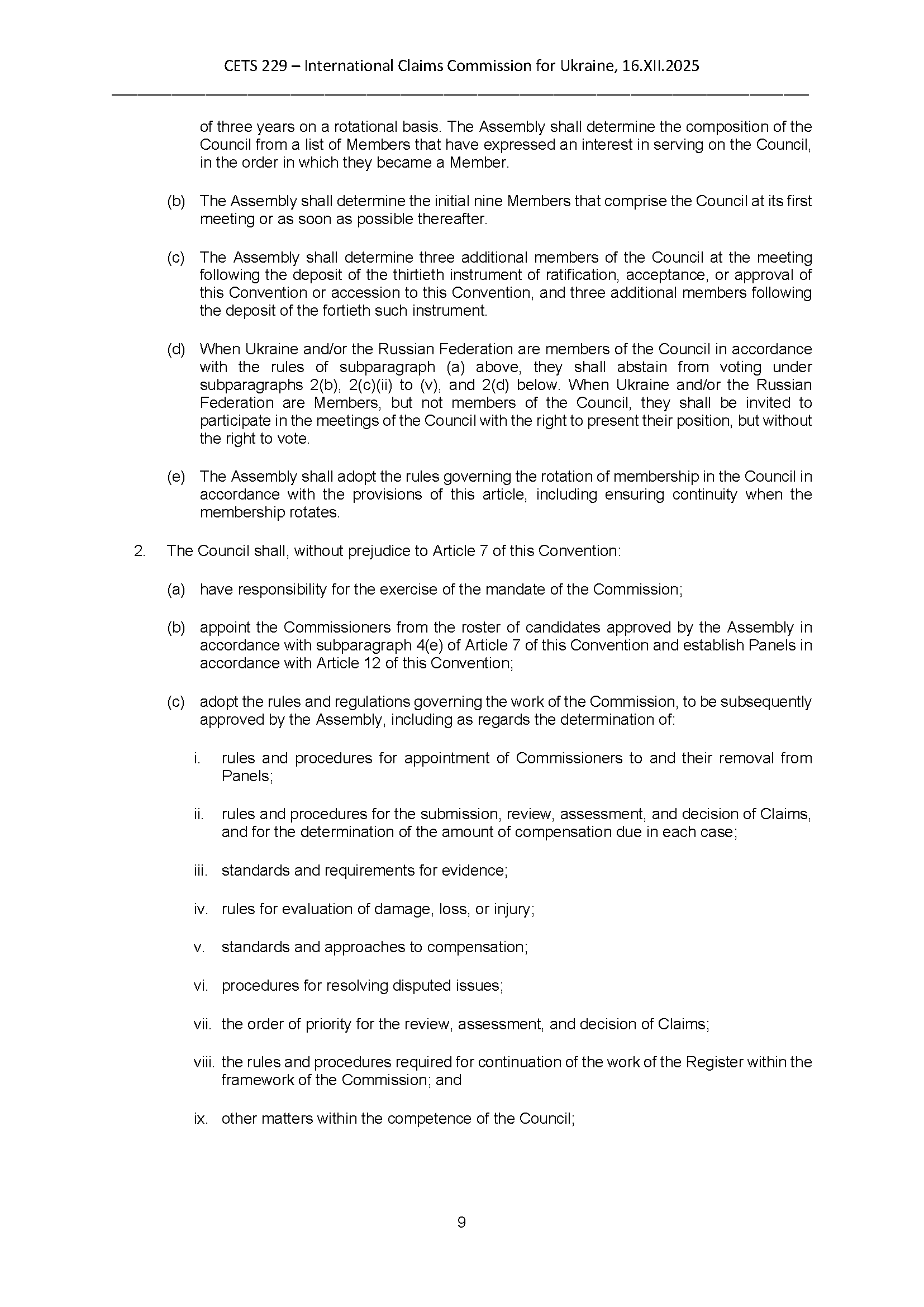 atzīmējot, ka šī konvencija ir šāds starptautisks dokuments un ka ar to tiek izveidota Starptautiskā Prasību komisija Ukrainai, kas ir starptautiskā kompensācijas mehānisma otrais elements, un kurā kā trešo elementu var iekļaut arī turpmāku kompensāciju fondu, kam uzdots izmaksāt kompensācijas par zaudējumiem, kaitējumu vai aizskārumu, ko radījušas Krievijas Federācijas starptautiski prettiesiskās darbības Ukrainā vai pret Ukrainu;