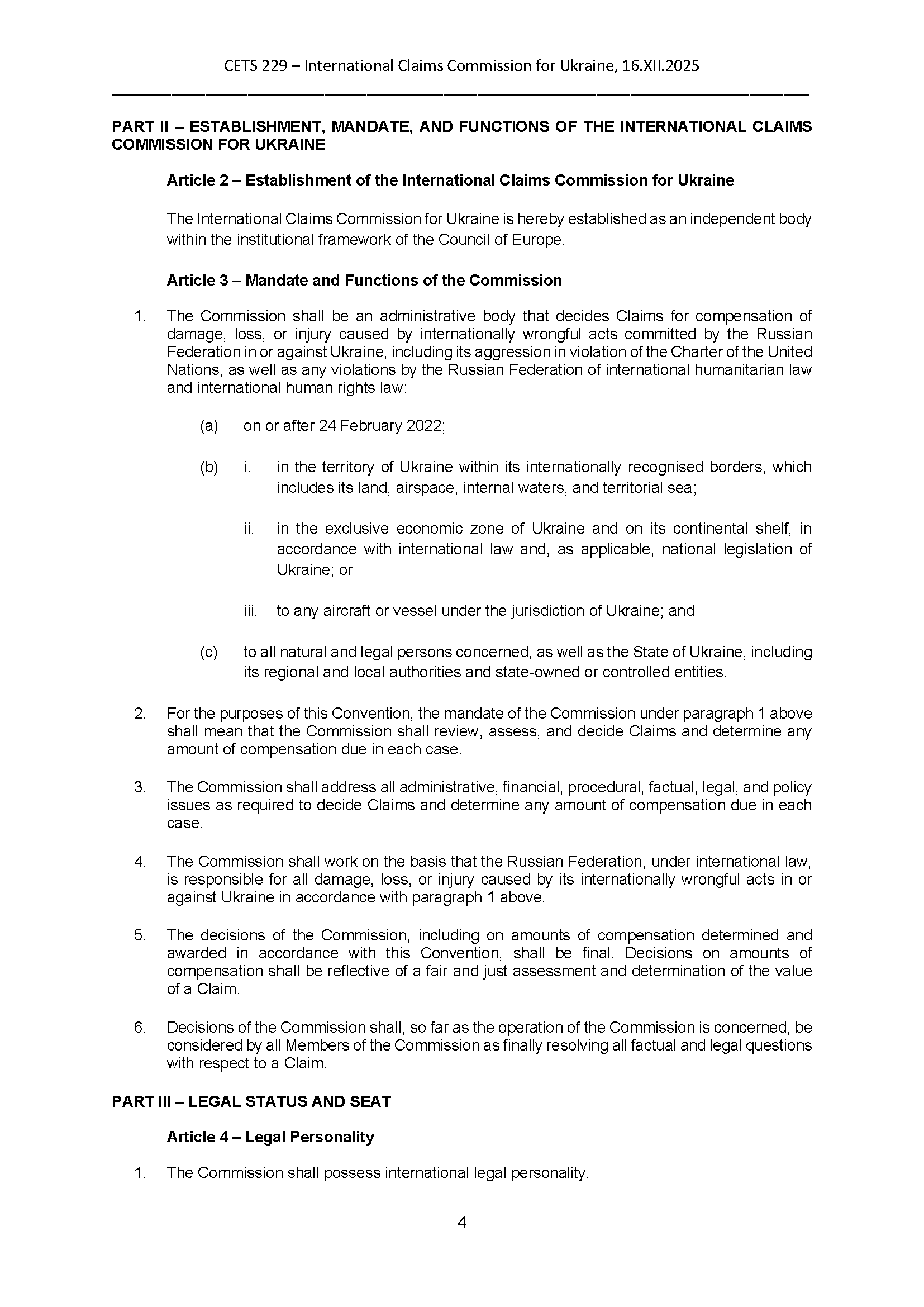 4. Komisija darbojas, pamatojoties uz to, ka Krievijas Federācija saskaņā ar starptautiskajām tiesībām ir atbildīga par visiem zaudējumiem, kaitējumu un aizskārumu, ko radījušas tās starptautiski prettiesiskās darbības Ukrainā vai pret Ukrainu saskaņā ar šā panta 1. daļu.