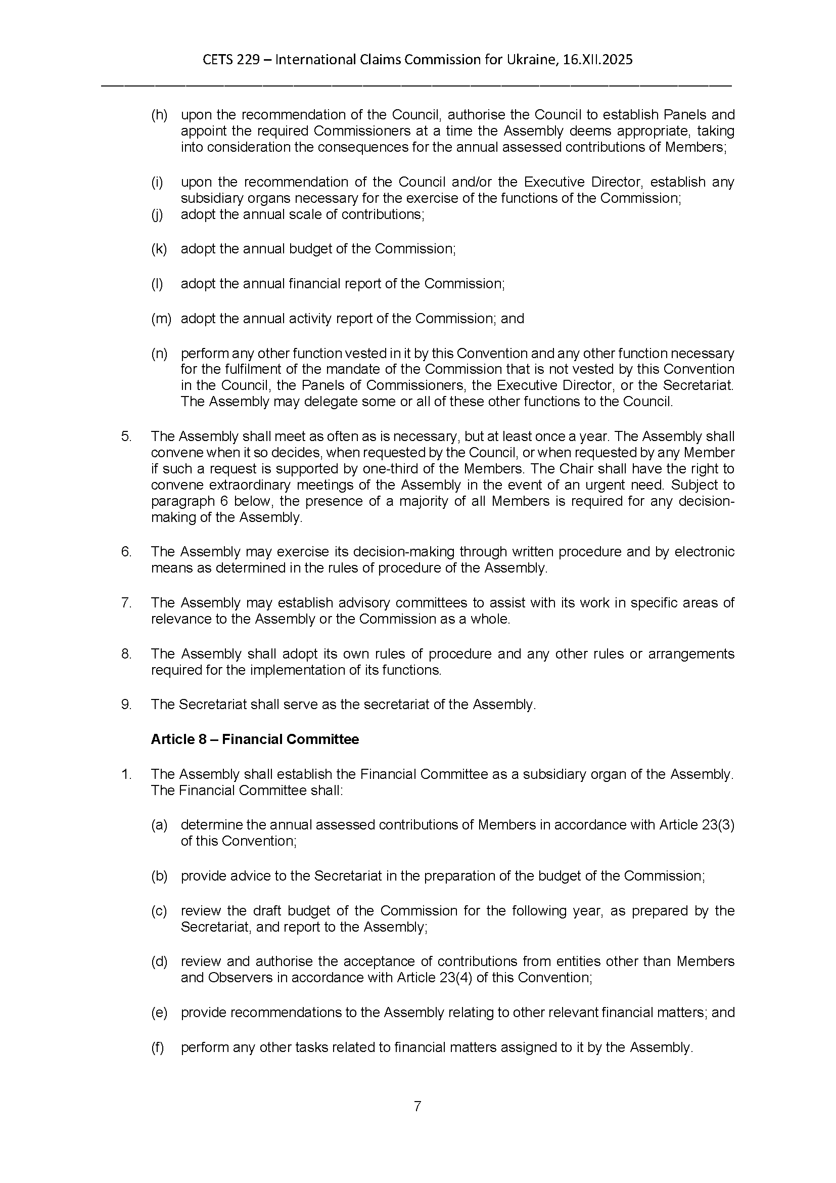 7. Asambleja var apturēt Dalībnieka tiesības, ja uzskata, ka šis Dalībnieks nav izpildījis šajā konvencijā noteiktās finanšu saistības.
