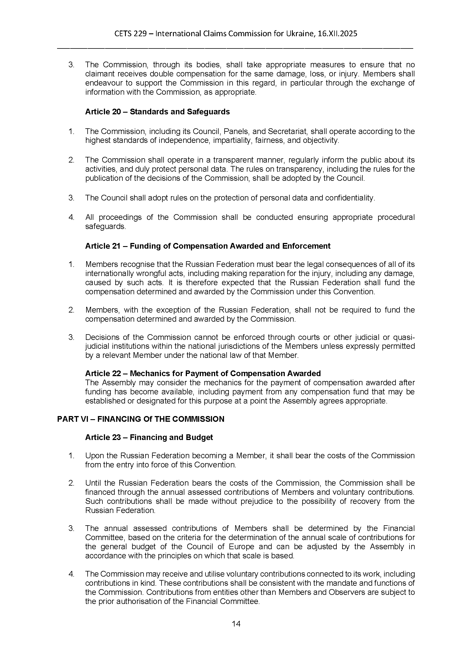1. Dalībnieki atzīst, ka Krievijas Federācijai ir jāuzņemas atbildība par juridiskajām sekām, ko radījušas visas tās starptautiski prettiesiskās darbības, tai skaitā jāveic reparācija par aizskārumu, tostarp jebkādiem zaudējumiem, kas nodarīti ar šādām darbībām. Tāpēc sagaidāms, ka Krievijas Federācijai jāfinansē kompensācijas, ko noteikusi un piešķīrusi Komisija saskaņā ar šo konvenciju.