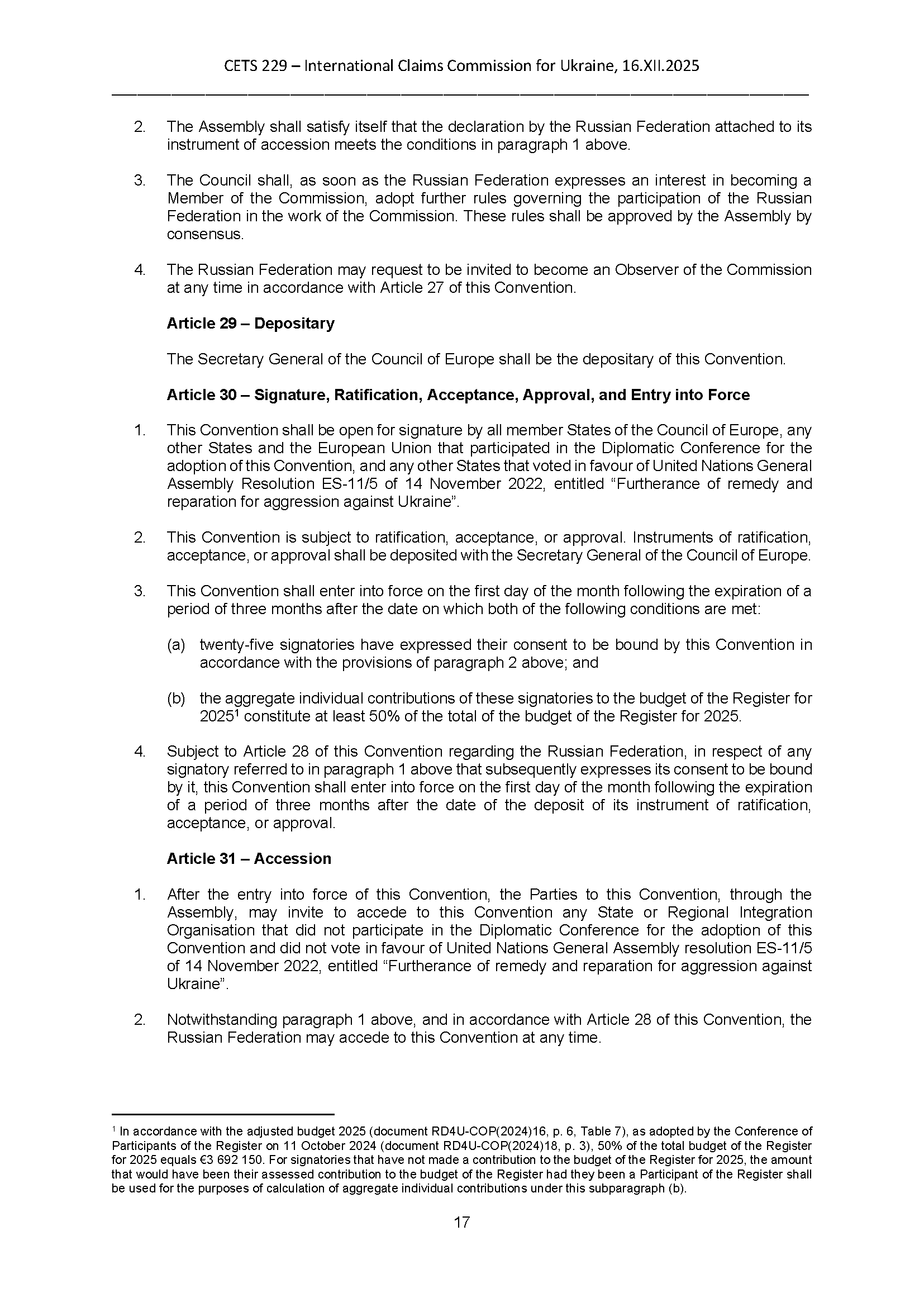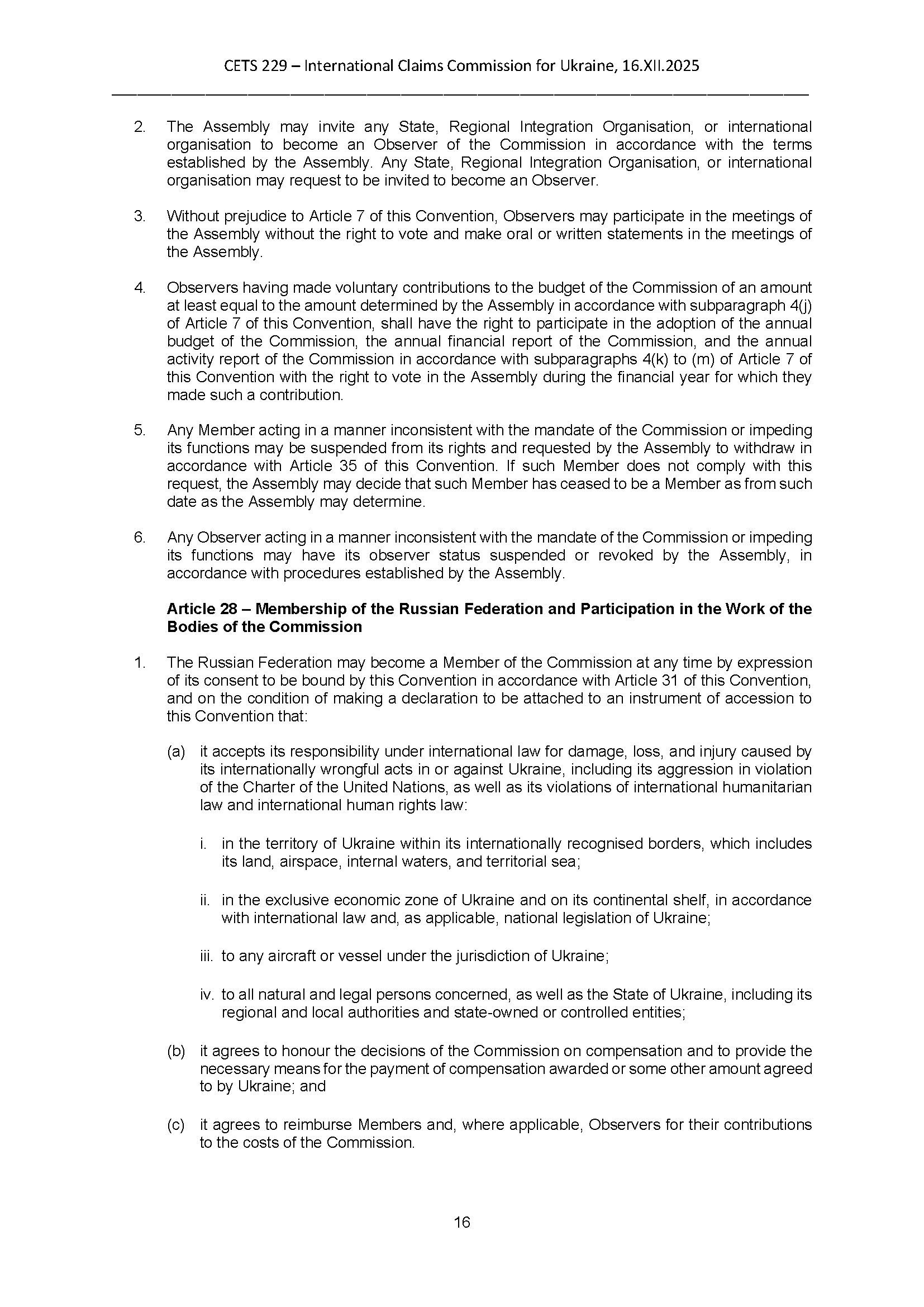 1. Pēc šīs konvencijas stāšanās spēkā tās puses ar Asamblejas starpniecību var uzaicināt pievienoties šai konvencijai jebkuru valsti vai reģionālu integrācijas organizāciju, kas nav piedalījusies diplomātiskajā konferencē par šīs konvencijas pieņemšanu un nav balsojusi par Apvienoto Nāciju Organizācijas Ģenerālās asamblejas 2022. gada 14. novembra rezolūciju ES-11/5 "Tiesiskās aizsardzības līdzekļu un reparāciju veicināšana saistībā ar agresiju pret Ukrainu".