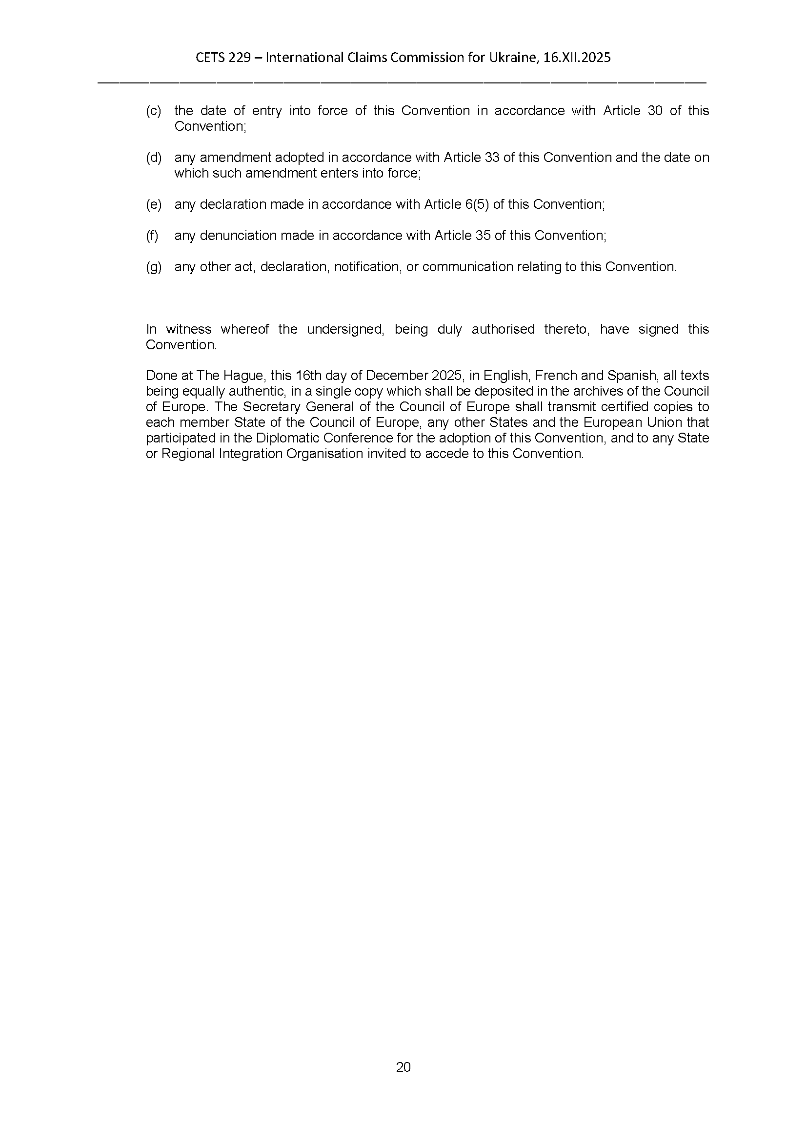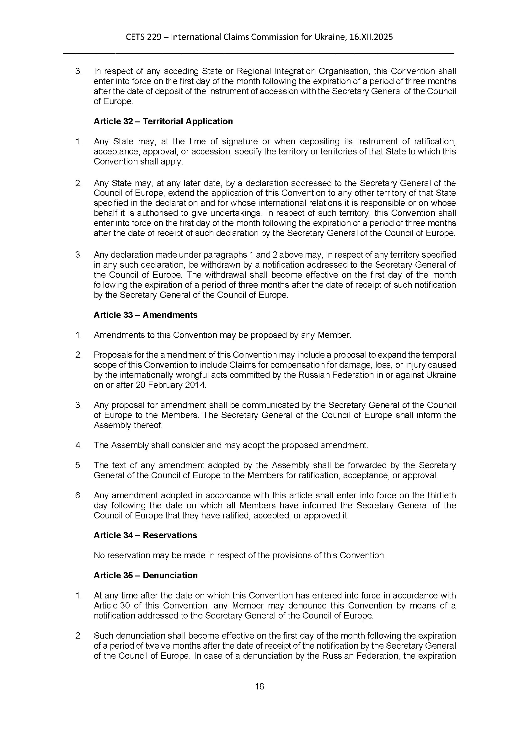 atzīmējot, ka, lai arī šī konvencija attiecas uz starptautiski prettiesiskām darbībām, ko veikusi Krievijas Federācija Ukrainā vai pret Ukrainu, sākot no 2022. gada 24. februāra, tā neatbrīvo Krievijas Federāciju no atbildības par tās starptautiski prettiesiskajām darbībām, kas veiktas Ukrainā vai pret Ukrainu, sākot no 2014. gada 20. februāra, kā arī neliedz iespēju nākotnē šo konvenciju grozīt, lai paplašinātu tās piemērojamību laikā līdz 2014. gada 20. februārim;
