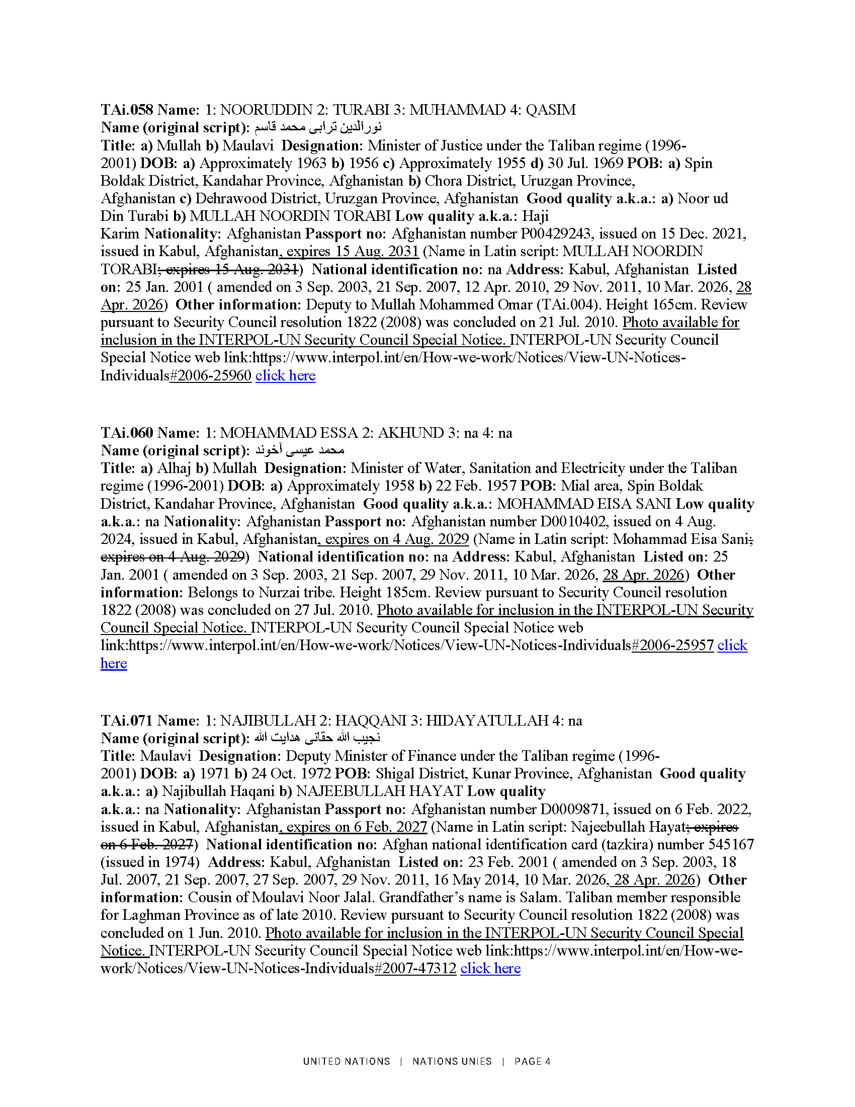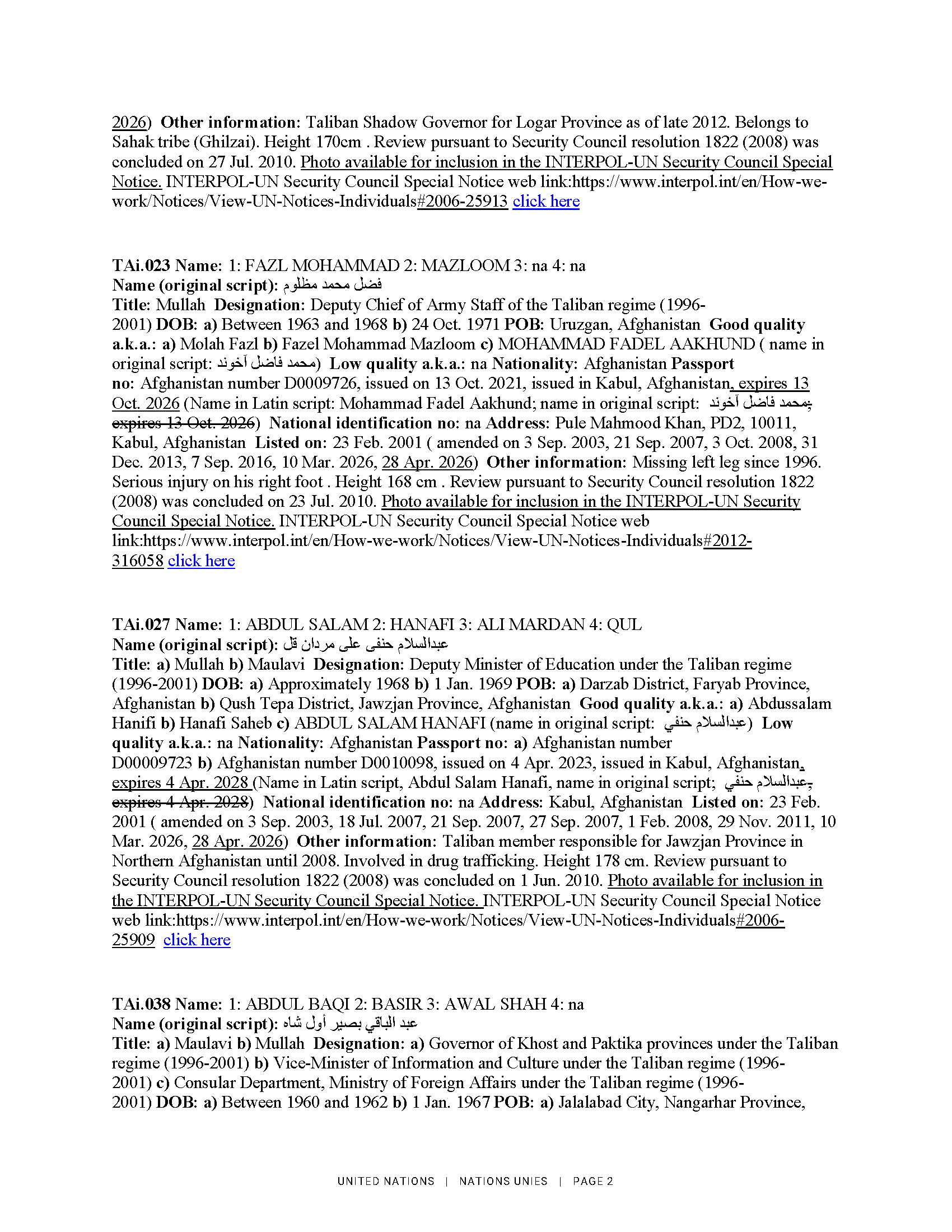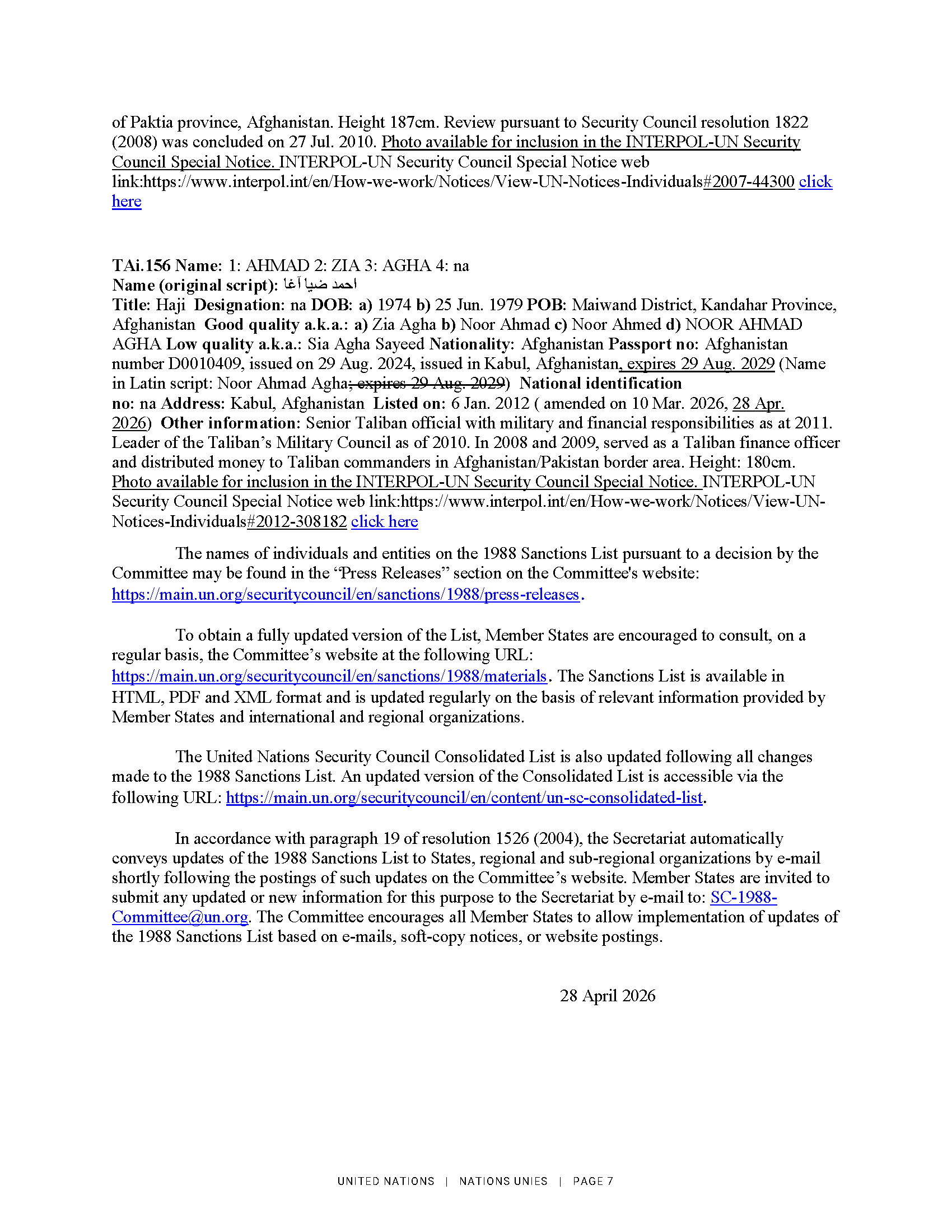 2026. gada 28. aprīlī ANO Drošības padome saskaņā ar rezolūciju Nr. 1988 (2011) grozīja informāciju par 17 Afganistānas pilsoņiem. Lūgums skatīt ANO notu un skaidrojošo informāciju pielikumā.