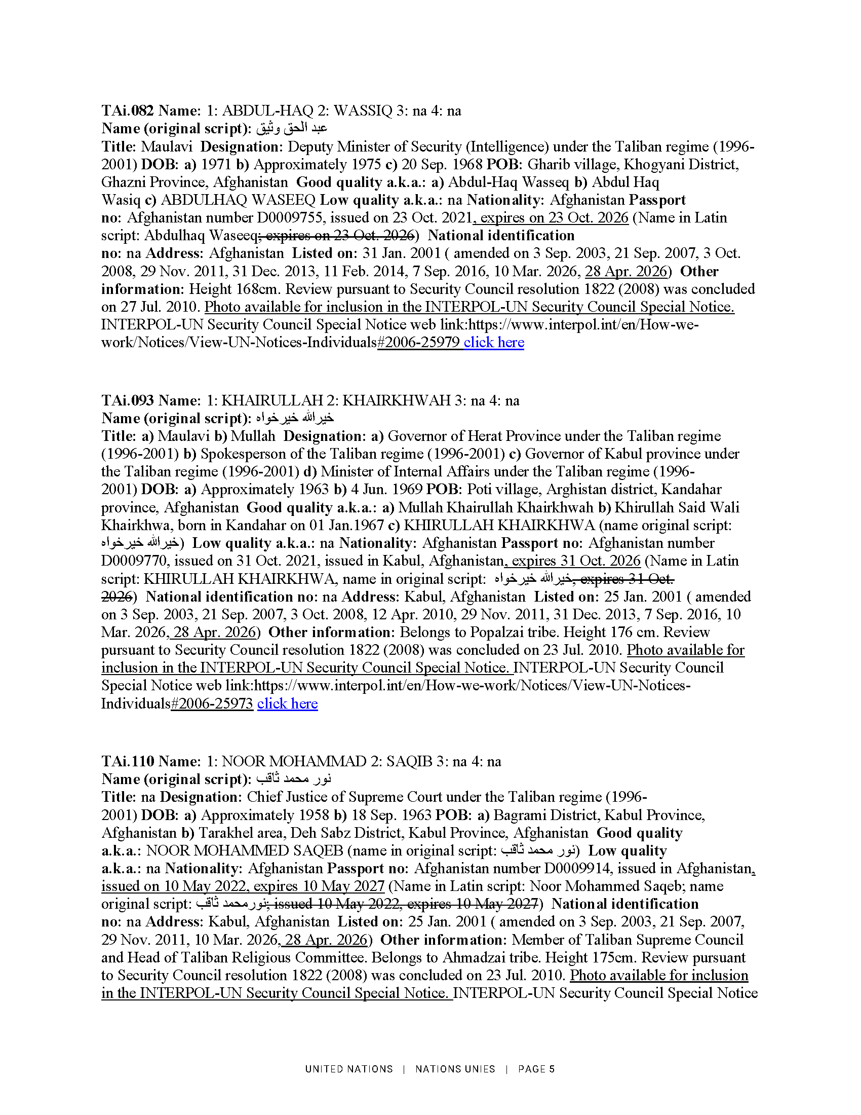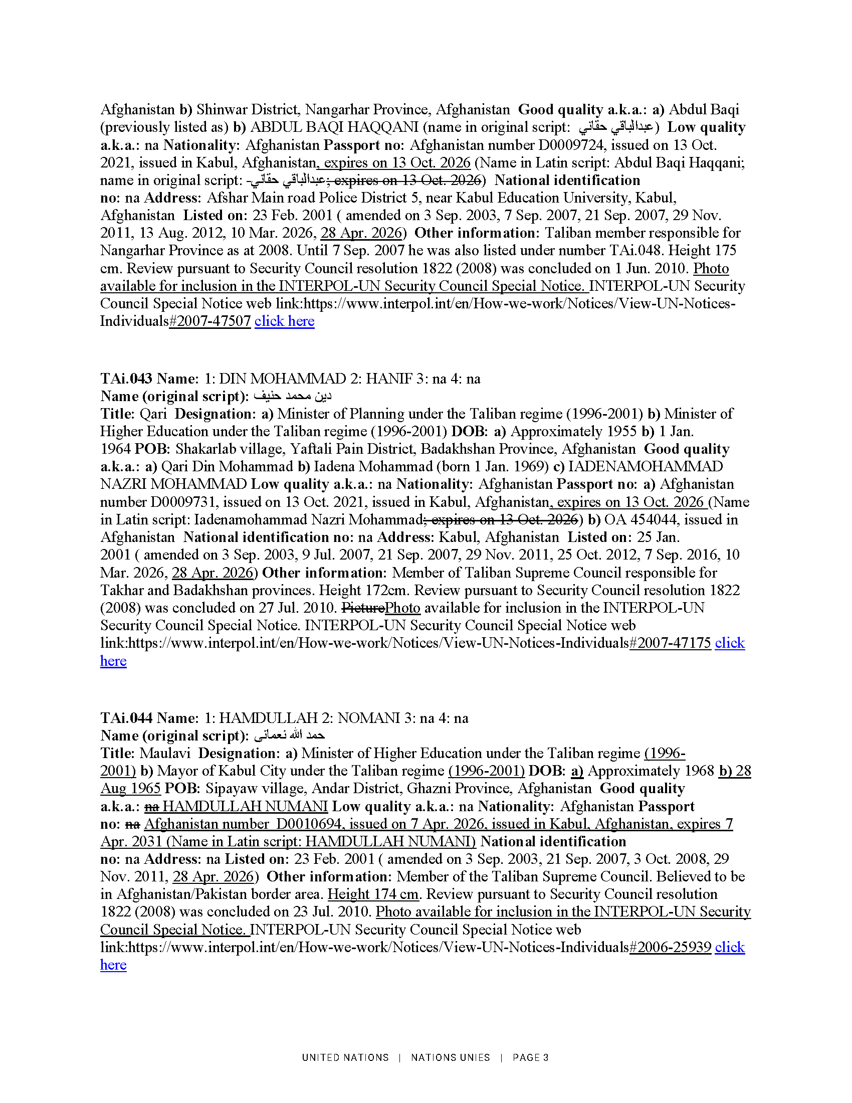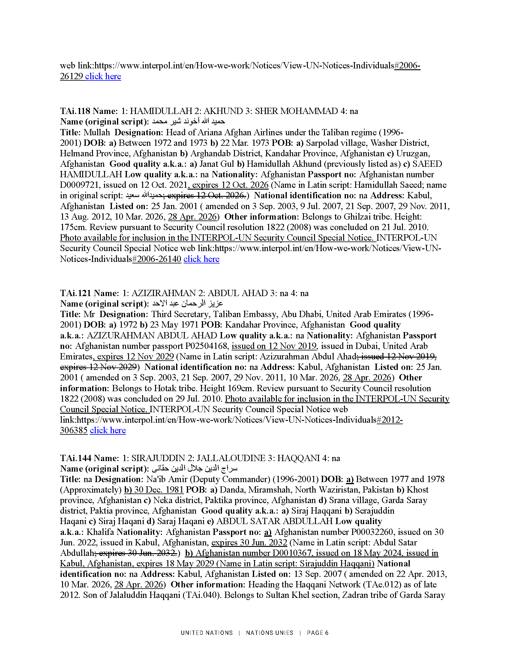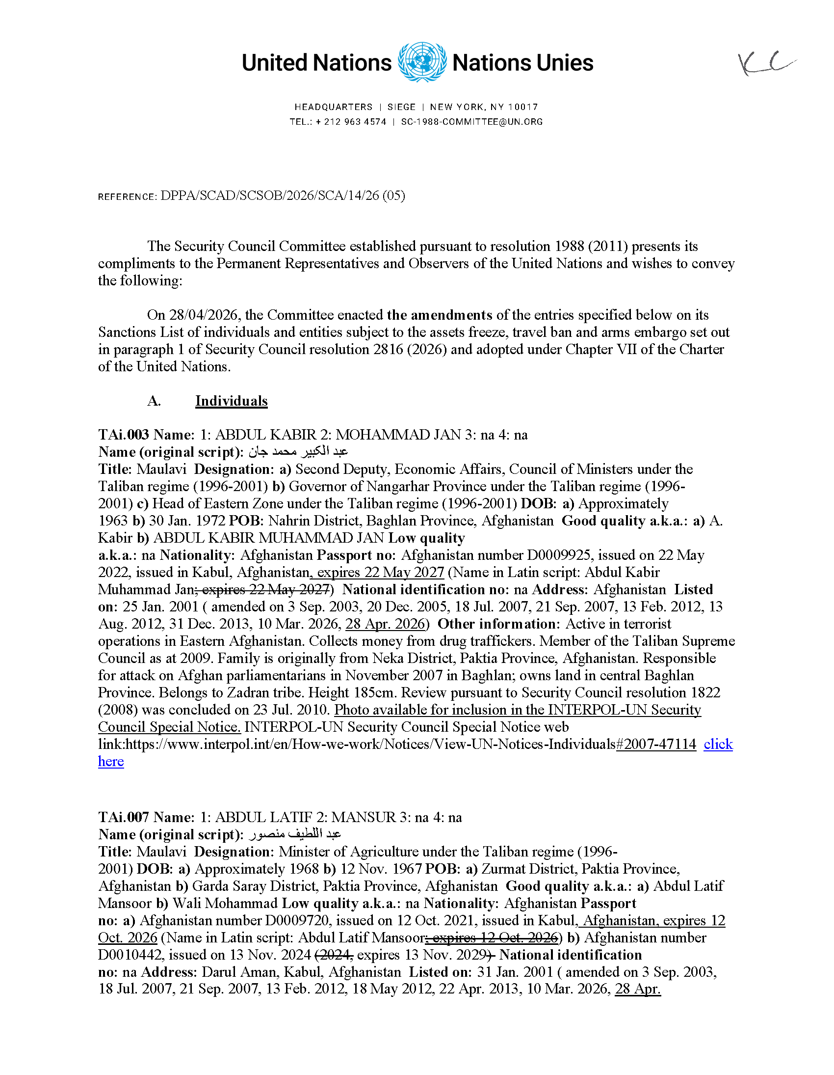 2026. gada 28. aprīlī ANO Drošības padome saskaņā ar rezolūciju Nr. 1988 (2011) grozīja informāciju par 17 Afganistānas pilsoņiem. Lūgums skatīt ANO notu un skaidrojošo informāciju pielikumā.