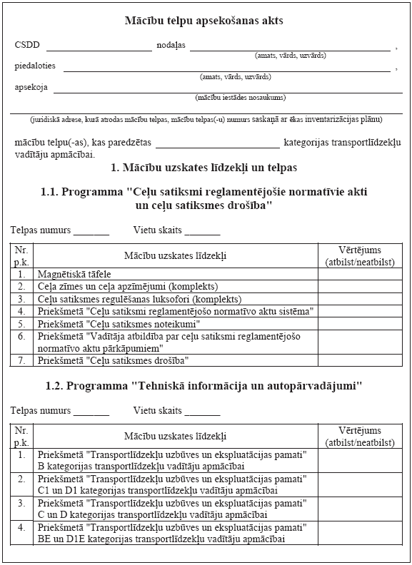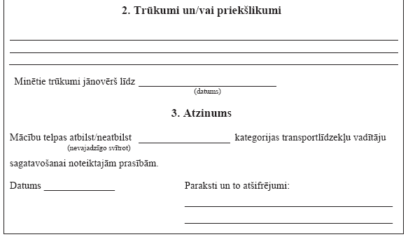 1.2. tas atbilst prasībām, kas mācību transportlīdzekļiem noteiktas normatīvajos aktos par transportlīdzekļu tehnisko stāvokli un aprīkojumu;